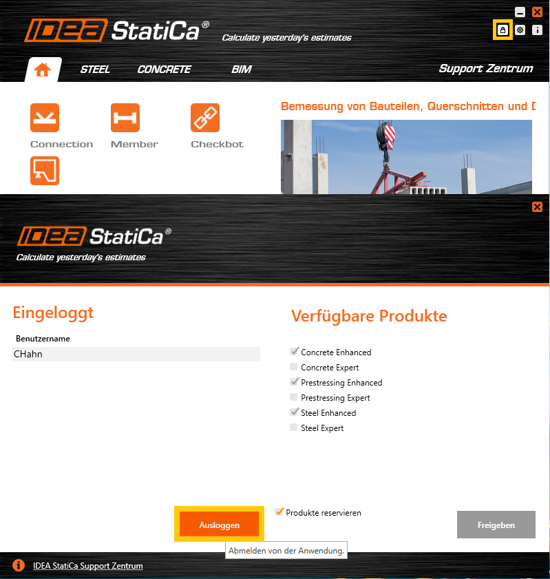Öffnen Sie den Lizenzmanager im Startmenü über das Schloss-Symbol und Ausloggen durch Klicken auf den entsprechenden Button