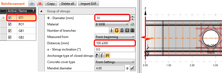 Nachdem die Last definiert wurde, können Sie mit der Eingabe/Bearbeitung der Bewehrung fortfahren. Sie werden die von der Vorlage erstellten Positionen nutzen.