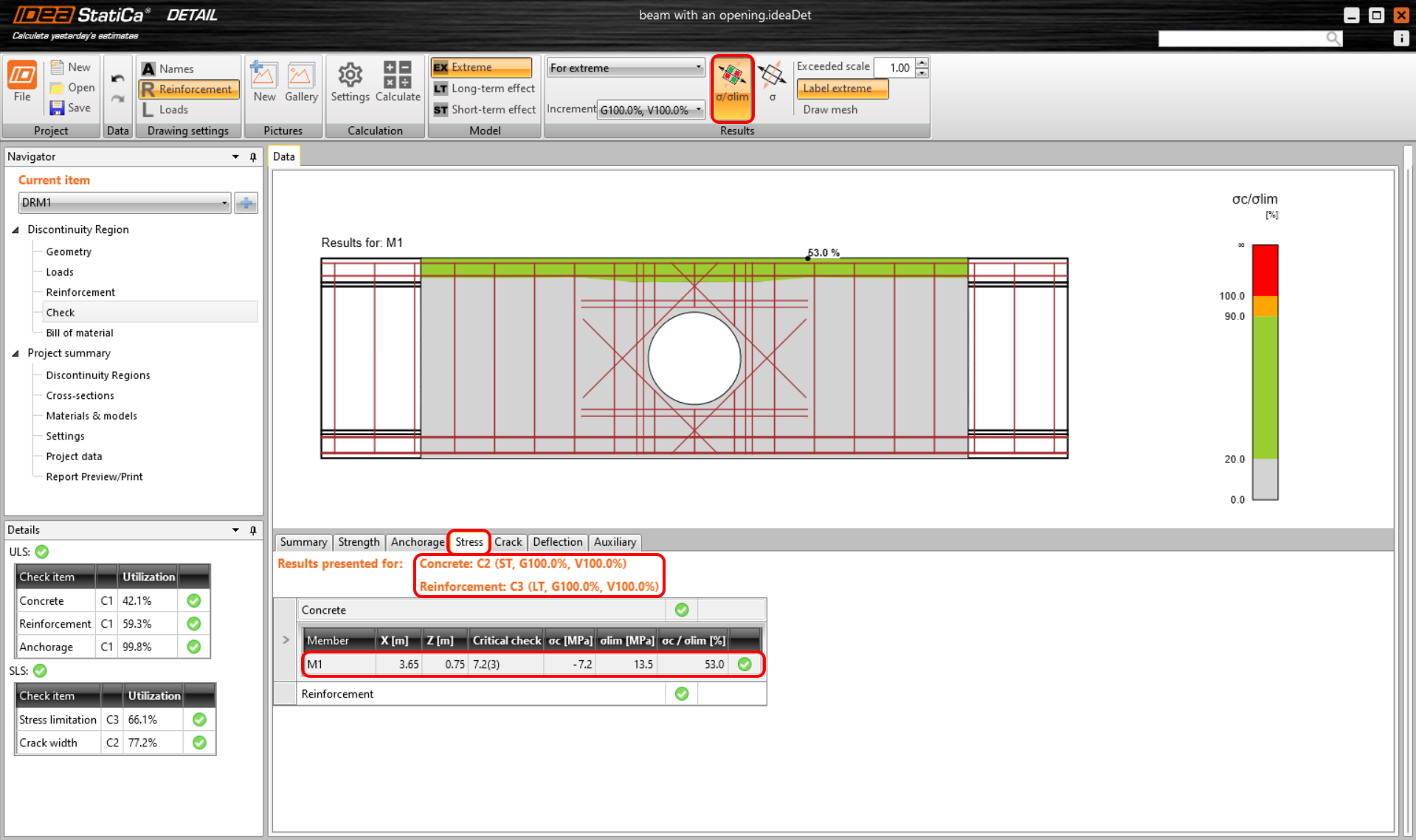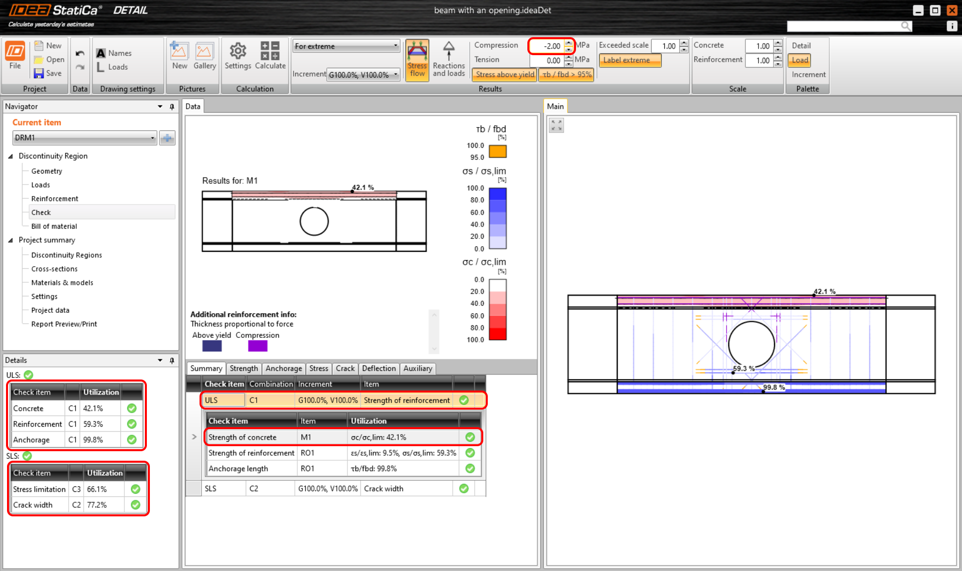 In der mittleren Tabelle sind alle detaillierten Ergebnisse zu finden. Im Moment wird der resultierende Festigkeitsnachweis des Betons für den GZT dargestellt. Im oberen Programmbereich kann der Grenzwert für das Diagramm geändert werden. Sie haben den Wert so geändert, dass nur Beton mit einer Druckbelastung über -2 MPa rot markiert ist.