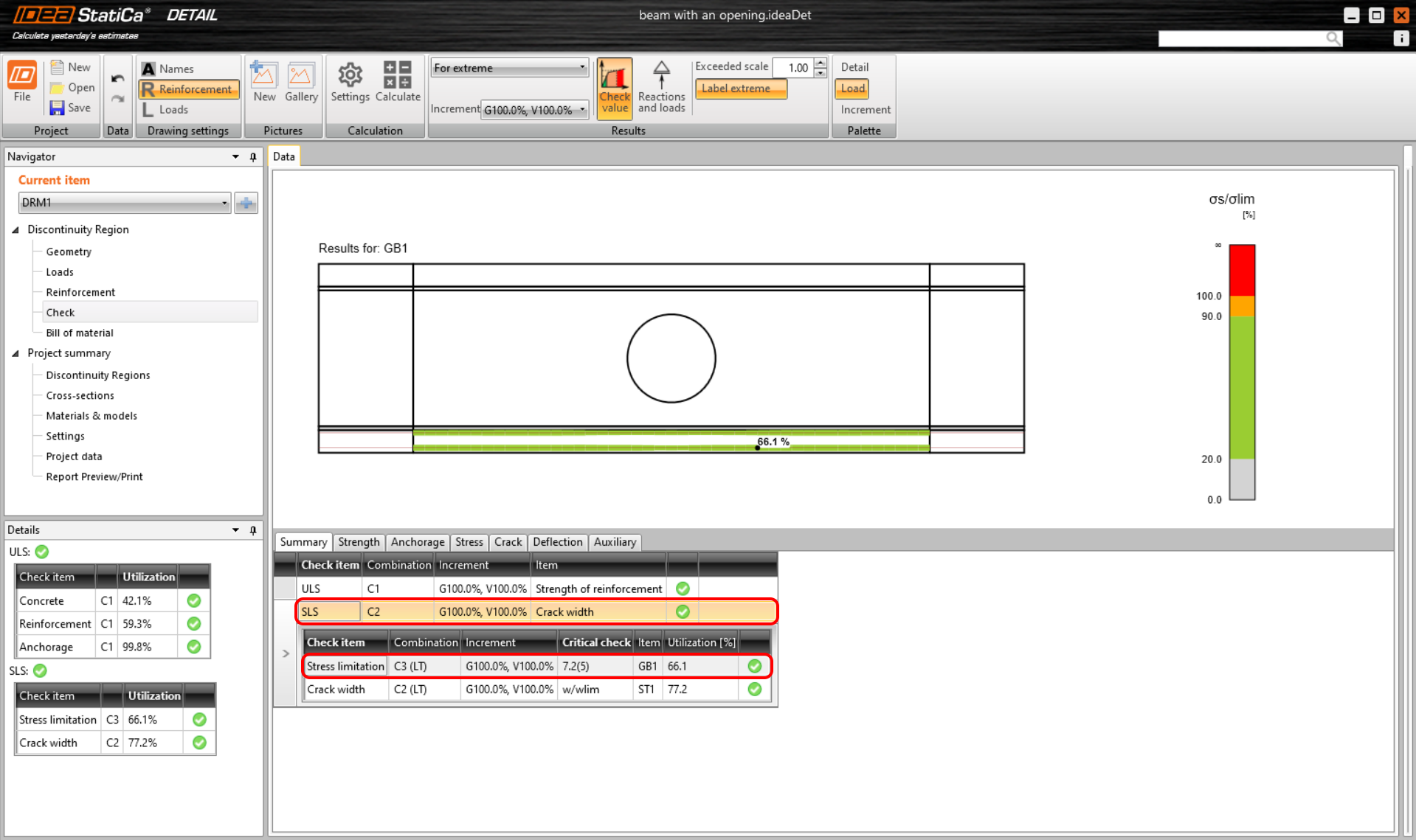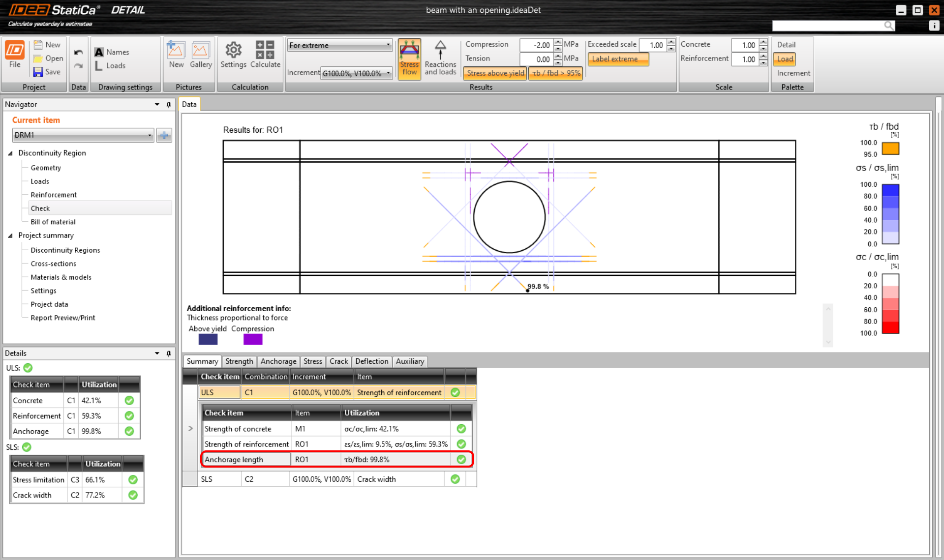 Durch Wechseln der oberen Programmbereiche können Sie alle Normnachweise anzeigen. In der Zusammenfassung werden die wichtigsten Ergebnisse für GZT/GZG dargestellt. Klicken Sie auf die Zeile in GZT/Verankerungslänge, um die Ausnutzung des Verbundes zwischen Beton und Bewehrung anzuzeigen (in der Abbildung ist die kritischste Stelle markiert).