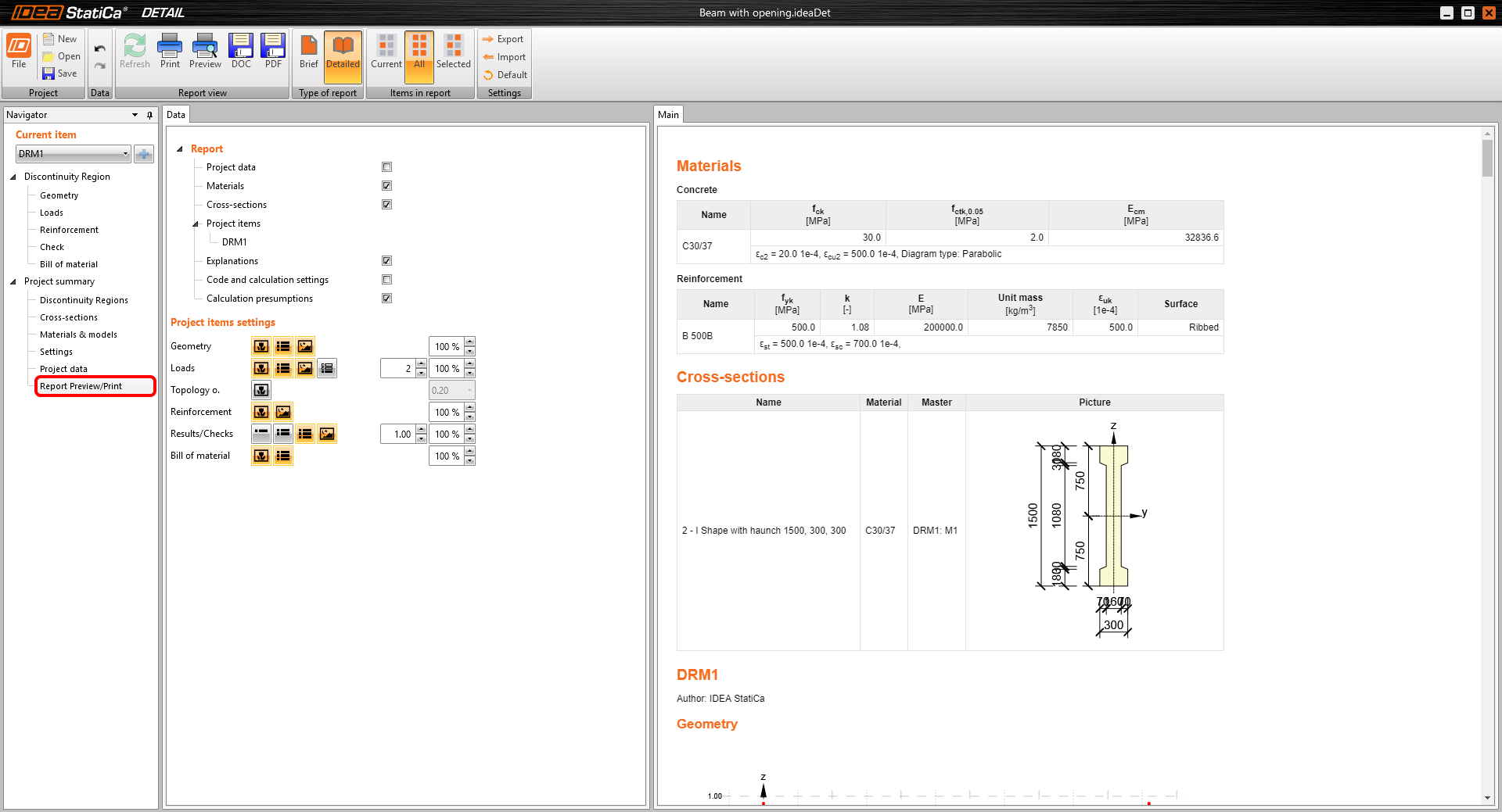 Gehen Sie zuletzt zu Berichtsvorschau/-druck. IDEA StatiCa bietet einen vollständig anpassbaren Bericht zum Ausdrucken oder Speichern in einem bearbeitbaren Format an.