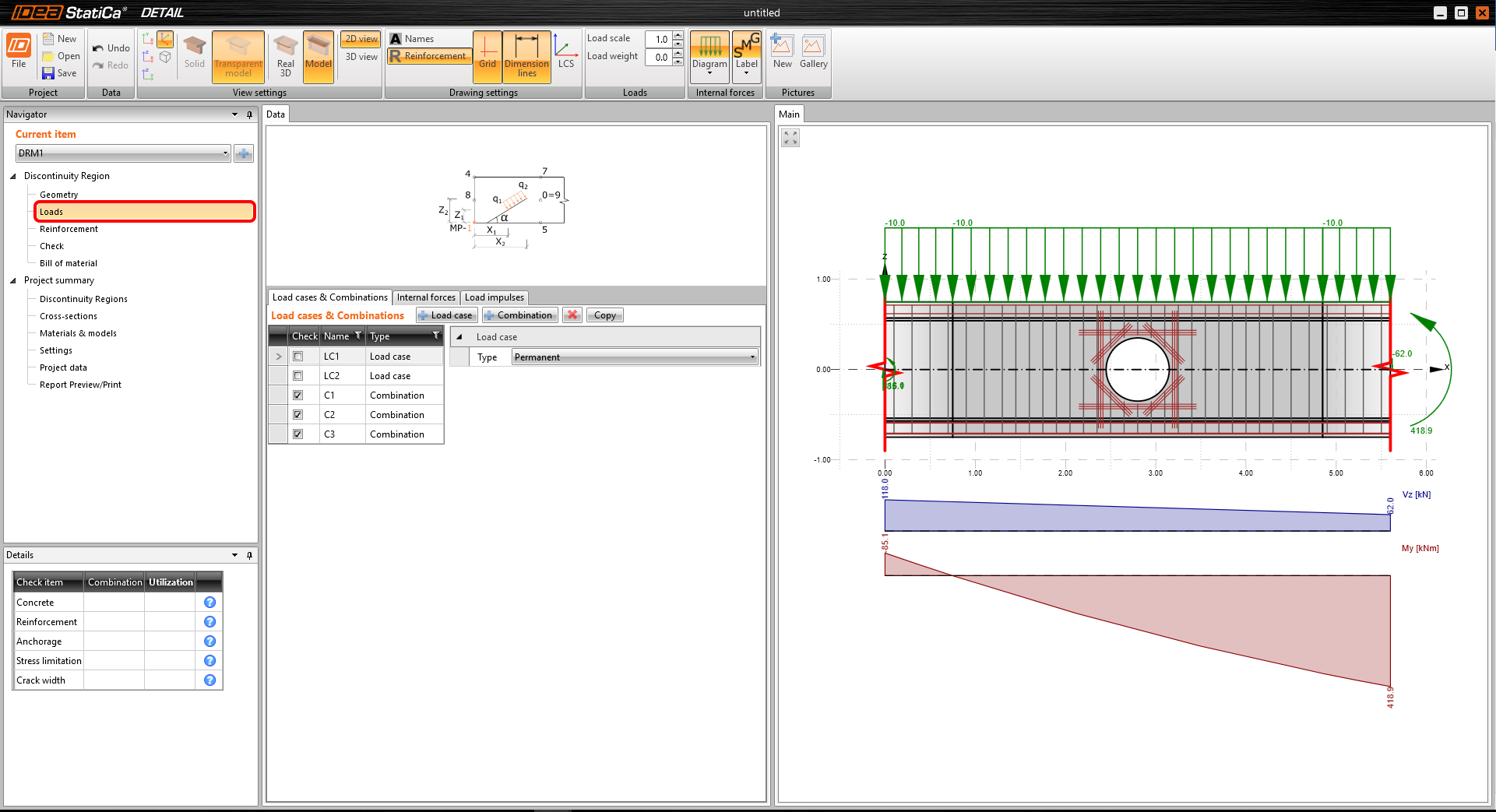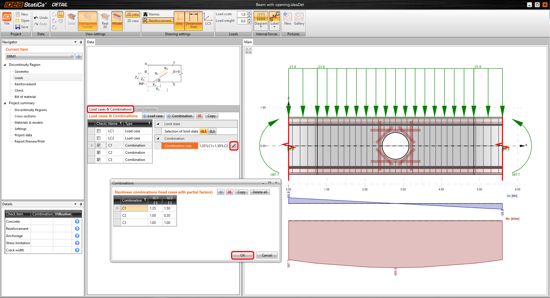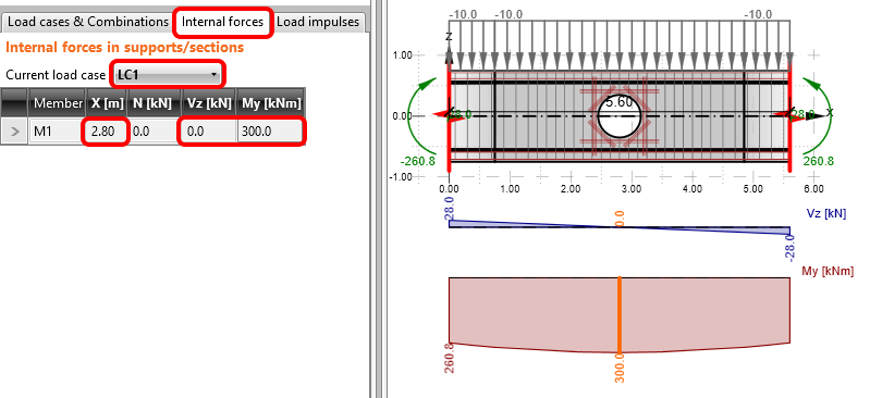 Ändern Sie für LC1 (ständige Last) die Schnittgrößen so, dass Sie die Werte für Querkraft und Biegemoment am Punkt der Öffnung eingeben.
