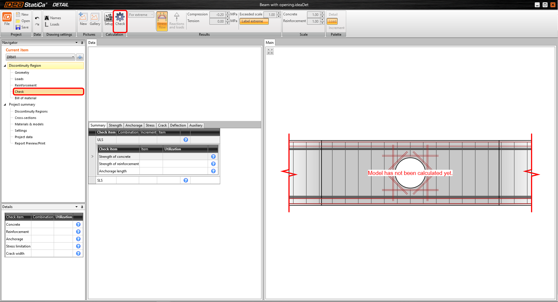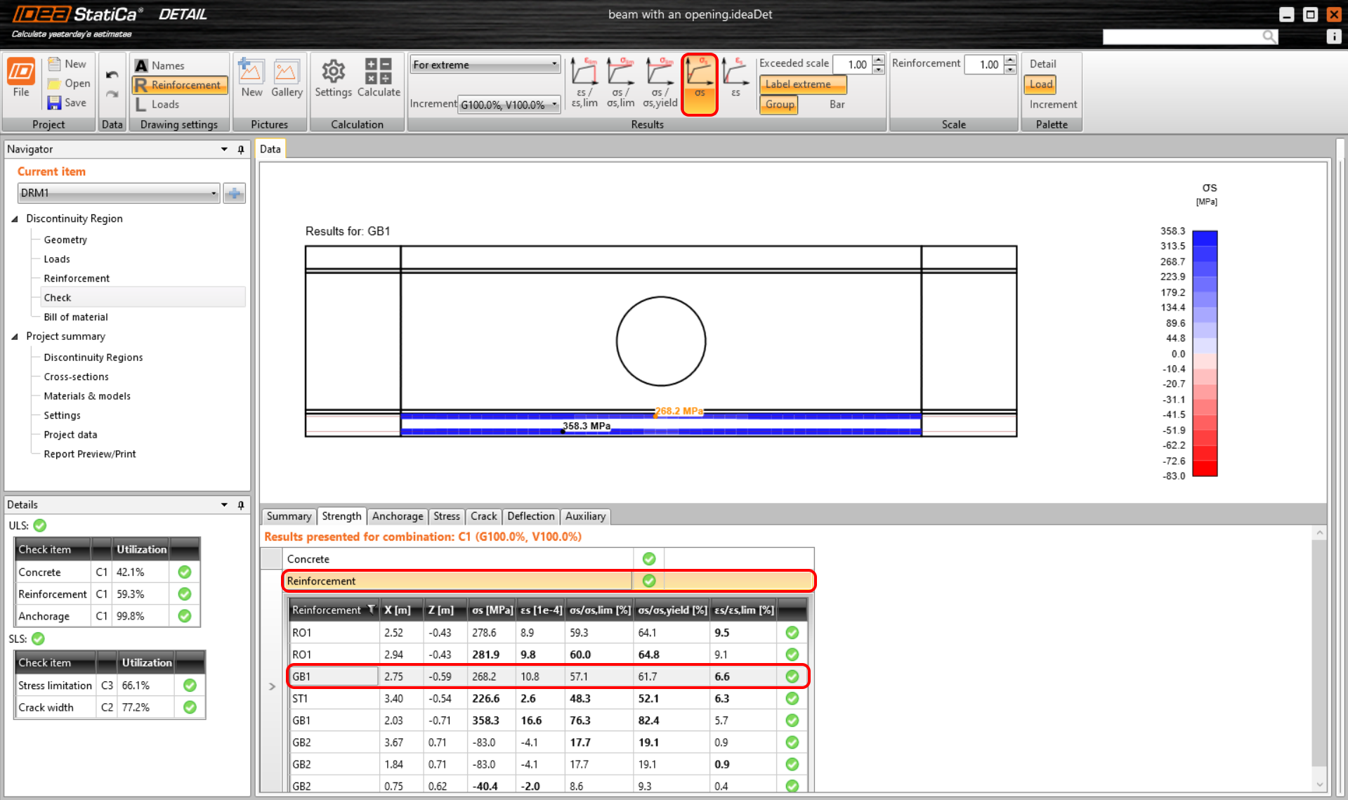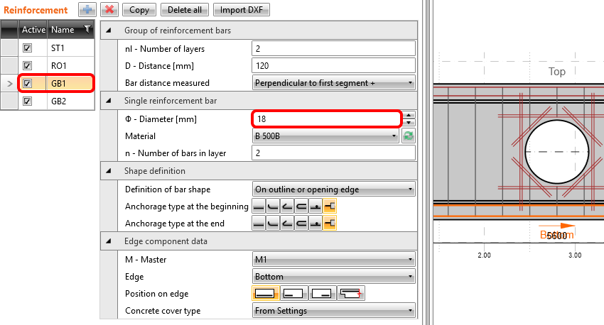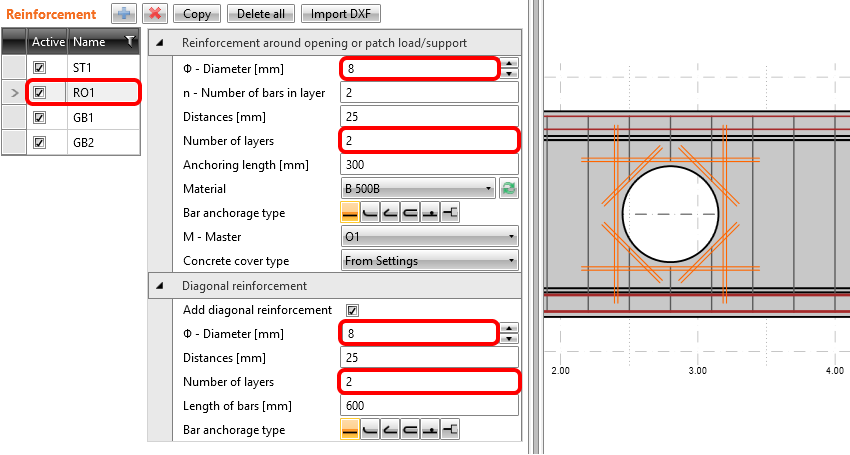 Reduzieren Sie den Durchmesser der Bewehrungsstäbe RO1 um die Öffnung und auch die Anzahl der Lagen von horizontalen/vertikalen und auch diagonalen Stäben.