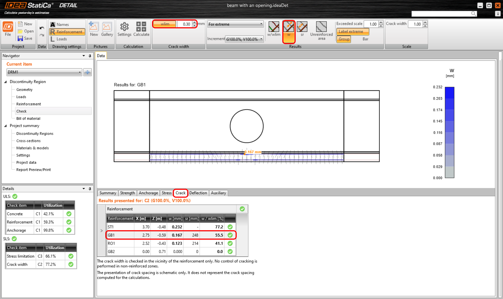 Berechnete Rissbreiten können in der Tabelle Riss (Kombination C2) angezeigt werden. Die berechneten Werte werden mit dem im oberen Programmbereich änderbaren Grenzwert w_{st,lim} verglichen.