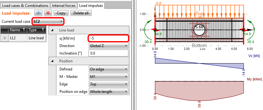 Ändern Sie auf ähnliche Weise die Werte der Schnittgrößen für LC2 (veränderliche Last).