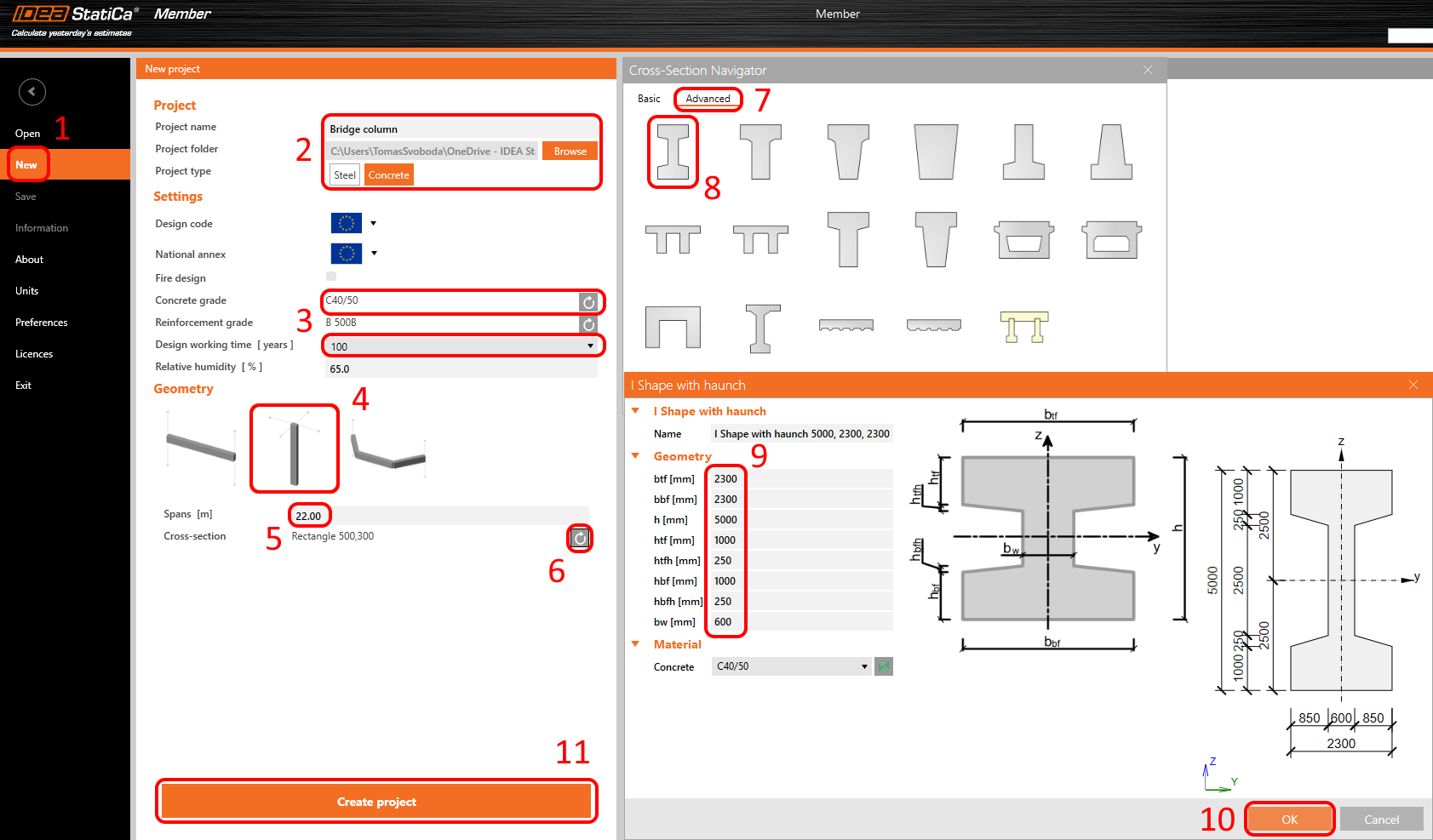 Create a new project (1), type its name, and select a folder where it will be saved. Then, choose the project type Concrete (2), and change the Concrete grade and Design working time (3). Choose the type of topology (4). Define the high of the column to 22 m (5). Click on the arrow (6) to set the cross-section. Select the Advanced (7) tab then I shape with haunch (8). Chance the dimensions (9) and click on the OK button (10). Finally, click on Create project (11).