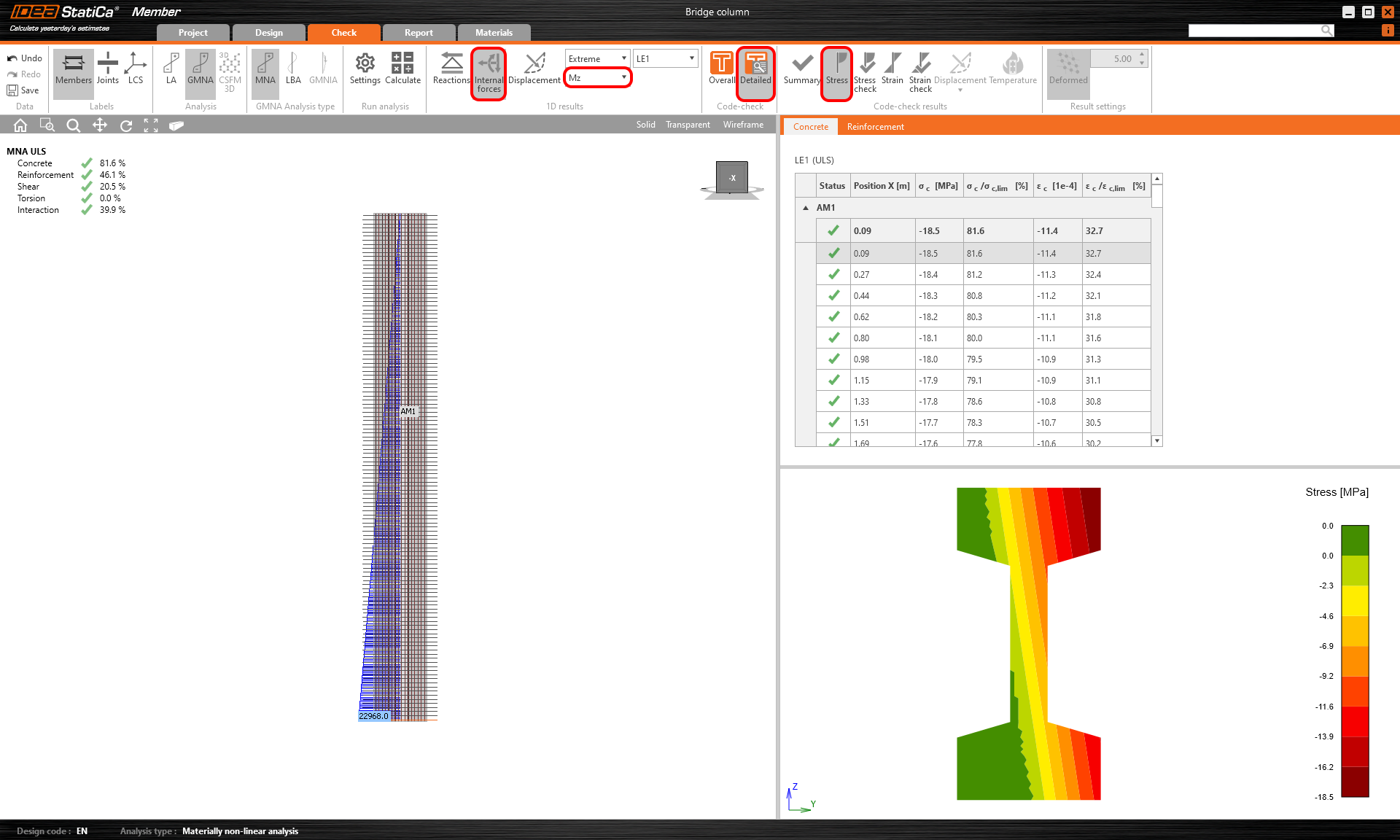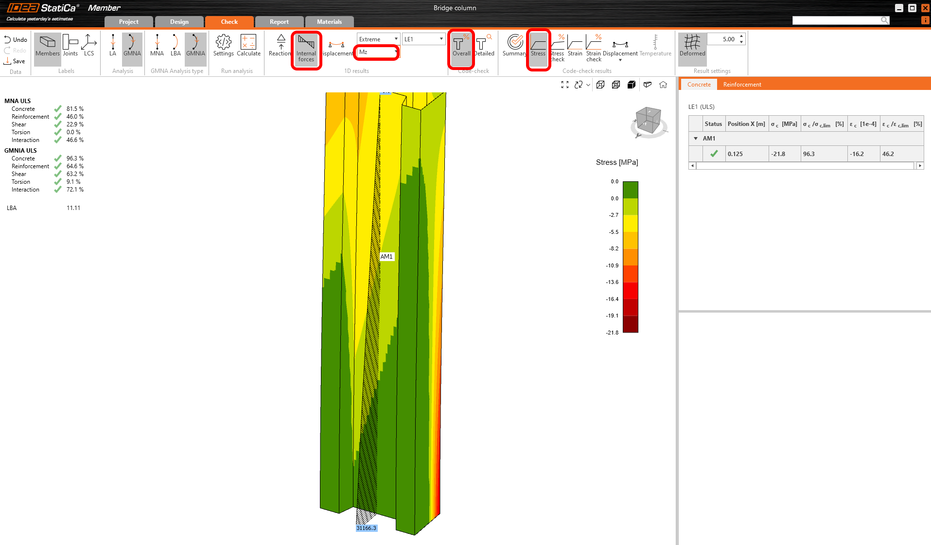 Once the calculation is completed. You can check the results. First, have the program displayed the bending moment Mz diagram. Then you can click on Detailed and Stress. Don't forget to choose the critical section. You will see the stress in the concrete.