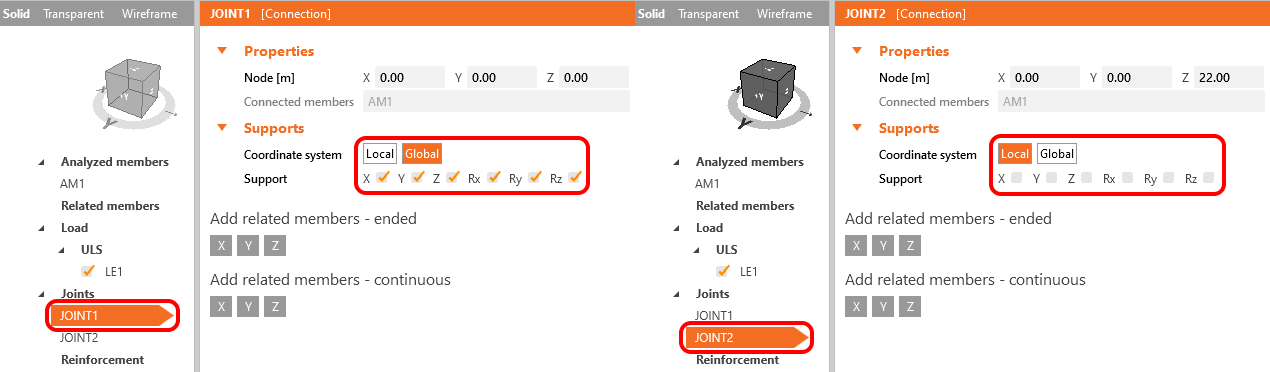 The modification of supports is needed. To do that, select JOINT1 and modify the support. After that select the second JOINT2 and change the support too. Degrees of freedom are defined in the figure below.