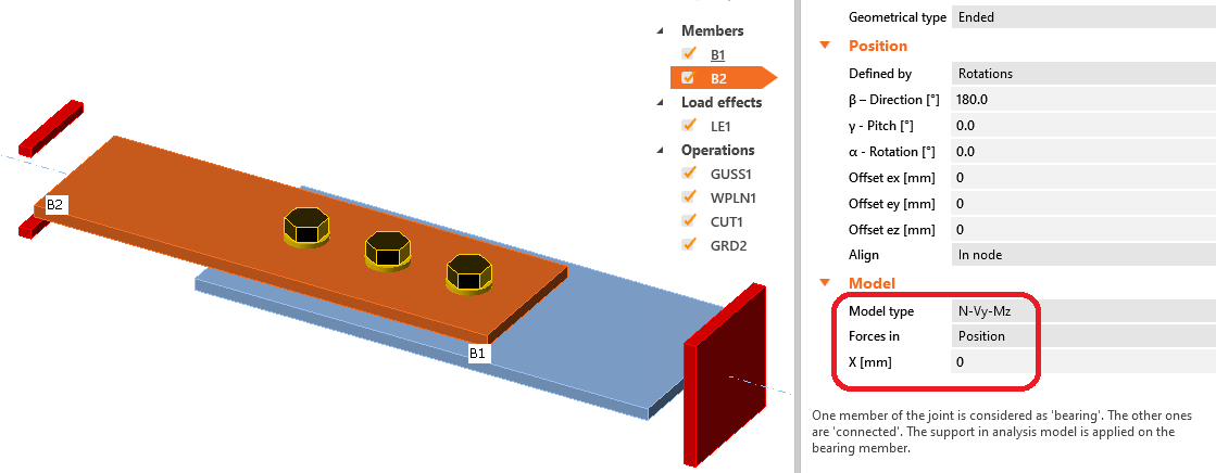 - Bei Modellen mit gelenkigen Anschlüssen ist der Modelltyp auf N-Vz-My und die Position der Scherkraft in Schrauben eingestellt.