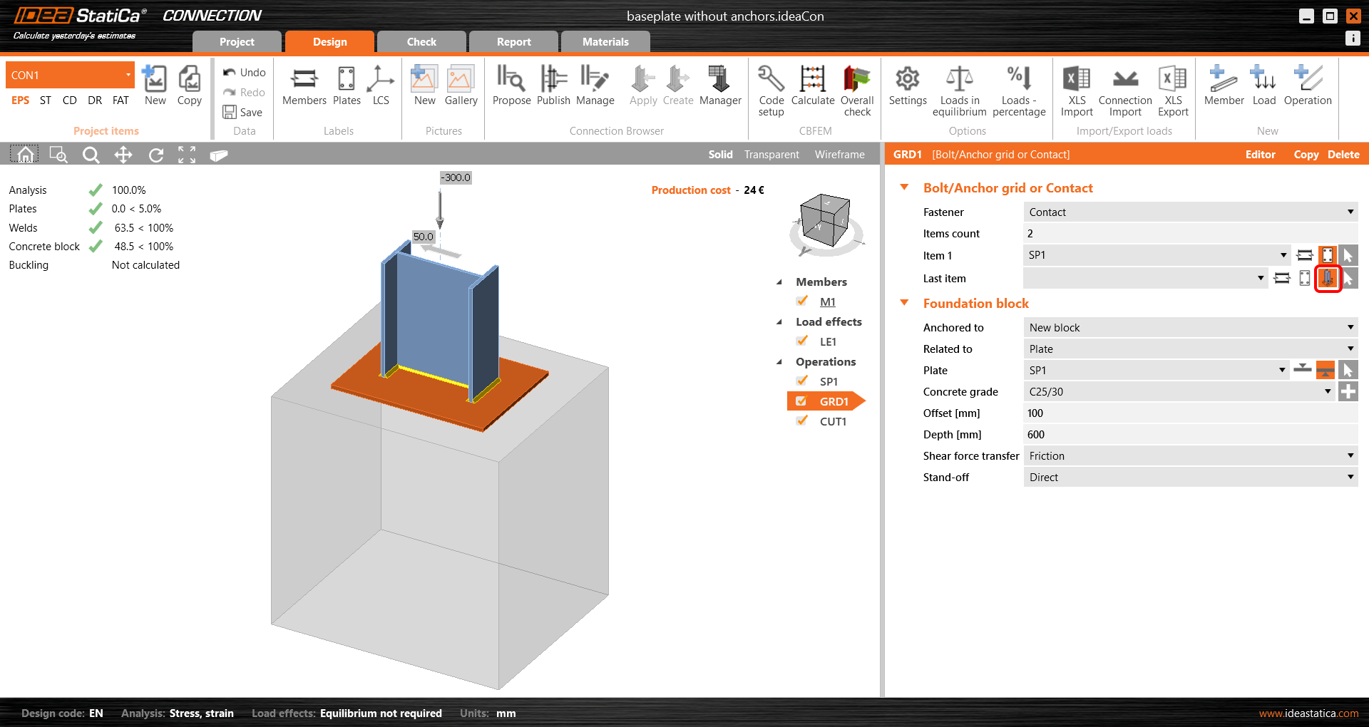 In der Anwendung IDEA StatiCa Connection wird der Betonblock als 2D-Kontaktelement vereinfacht. Der Kontakt zwischen Beton und Fußnplatte funktioniert nur auf Druck und die Druckkraft wird über das Winkler-Pasternak Untergrundmodell übertragen.