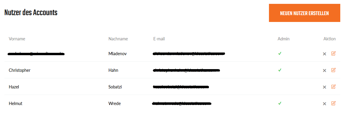 Vom Admin des Accounts können Nutzer mittels Mailadresse/Nickname hinzugefügt und ebenfalls als Admin eingestellt werden (mehrere Admins in einem Account möglich)