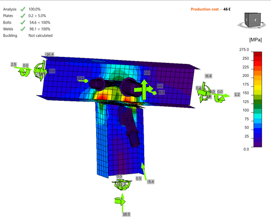 Für jede Verbindung in Checkbot wird die nichtlineare Analyse über das Symbol Berechnen im oberen Bereich gestartet. Das Statikmodell wird automatisch generiert, die Berechnung durchgeführt und Sie können die Ergebnisse überprüfen. Den Gesamtnachweis sehen Sie direkt in der Tabelle im linken Teil der 3D-Darstellung.