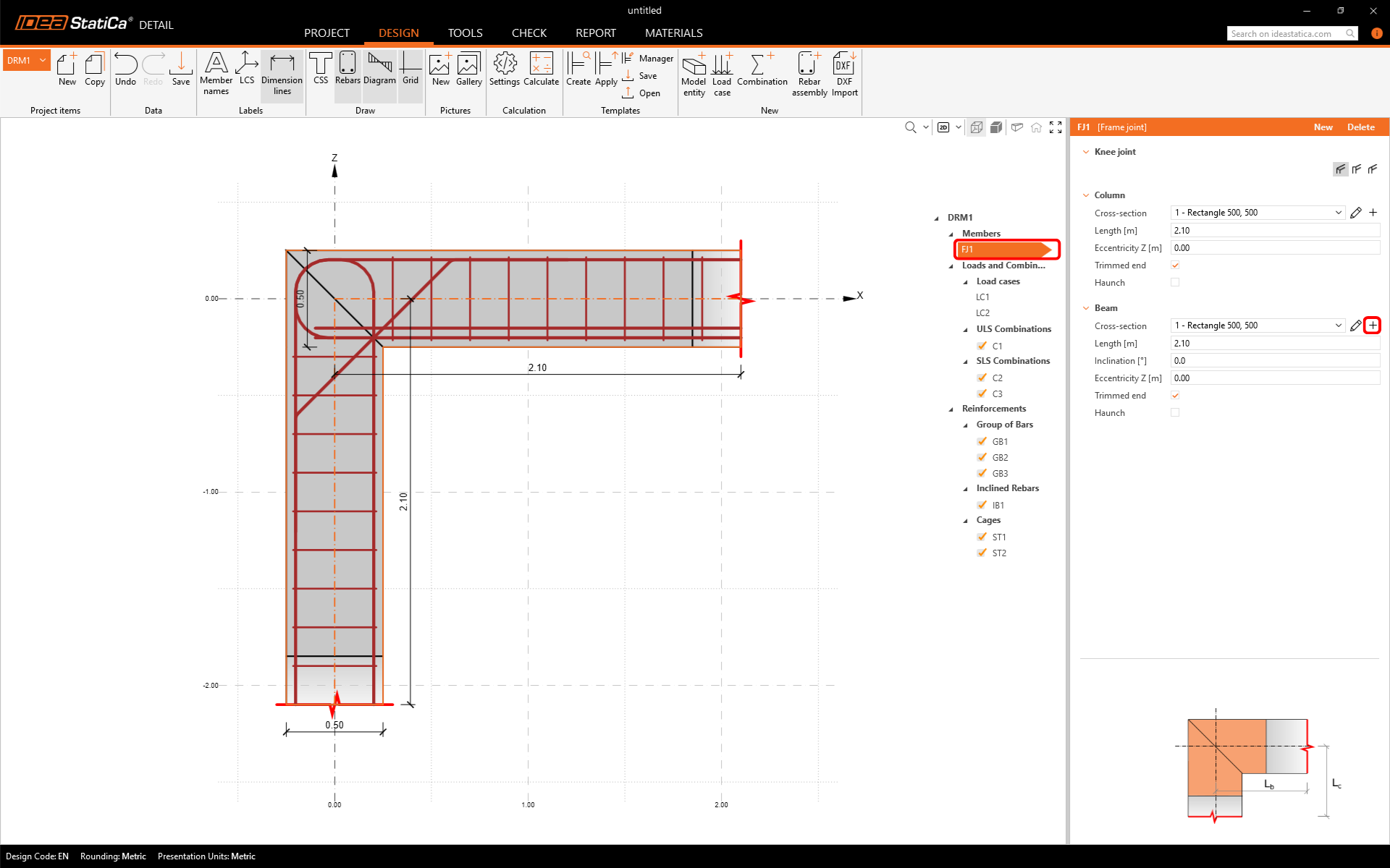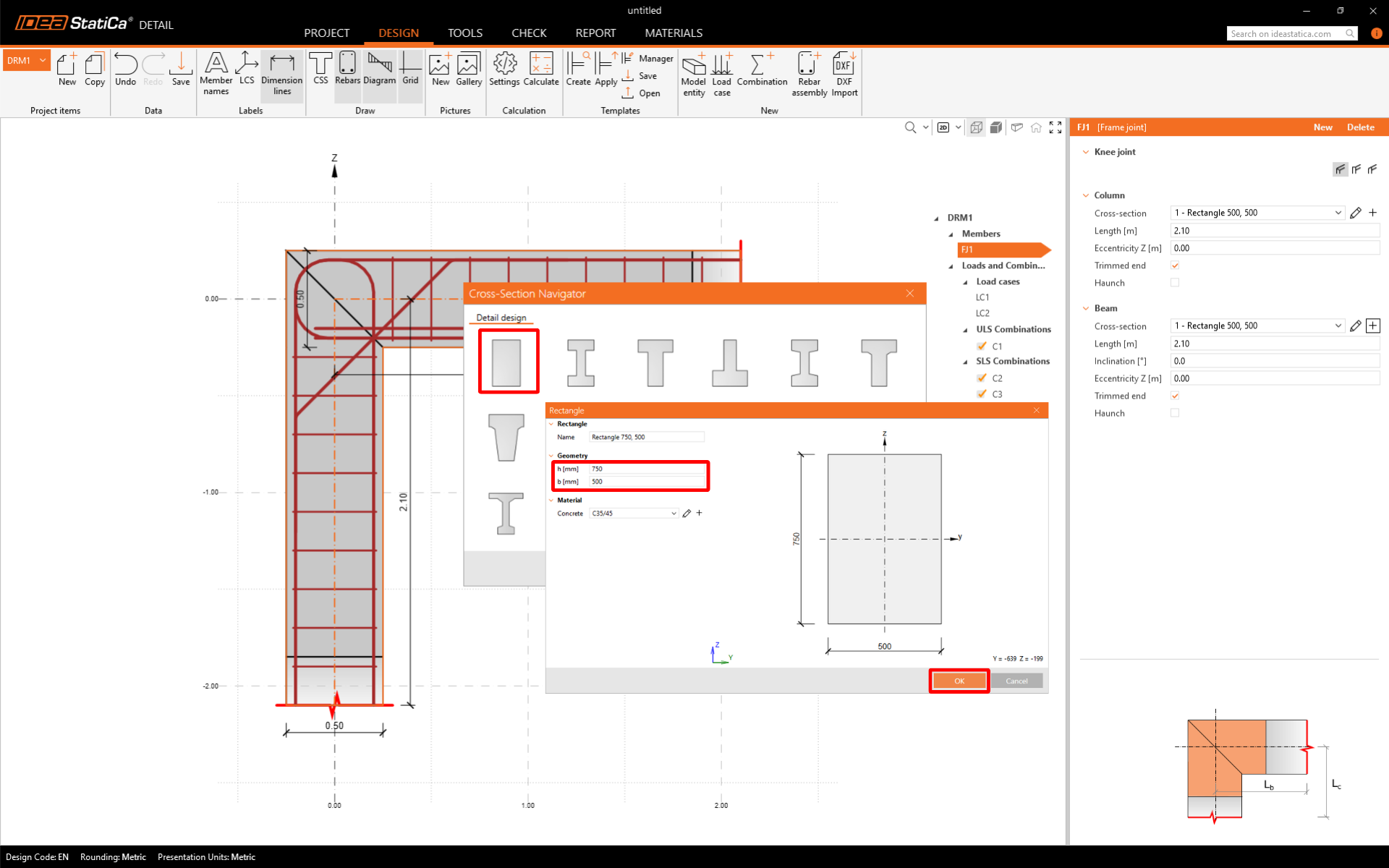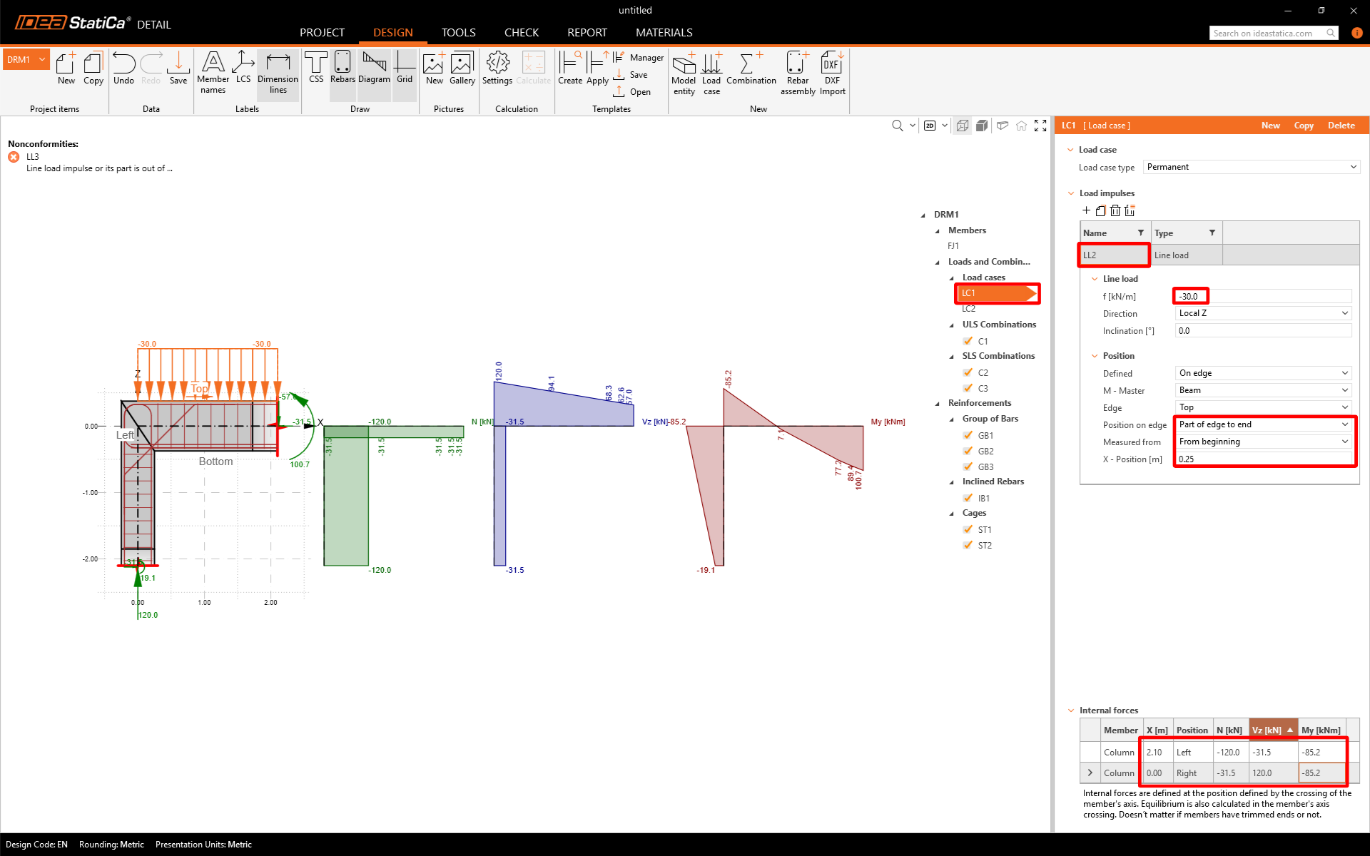 Dann können Sie die Intensität der Linienlast auf dem Träger ändern. In der unteren Tabelle geben Sie die Werte der Schnittgrößen ein, die auf den Querschnitt im Schnittpunkt der Stütze und des Trägers wirken. Sie können diese Schnittgrößen durch Modellierung und Berechnung des gesamten Rahmens mit der entsprechenden Linienlast (30 kN/m für LC1 und 20 kN/m für LC2) in jeder CAE/FEM-Software in wenigen Minuten ermitteln.