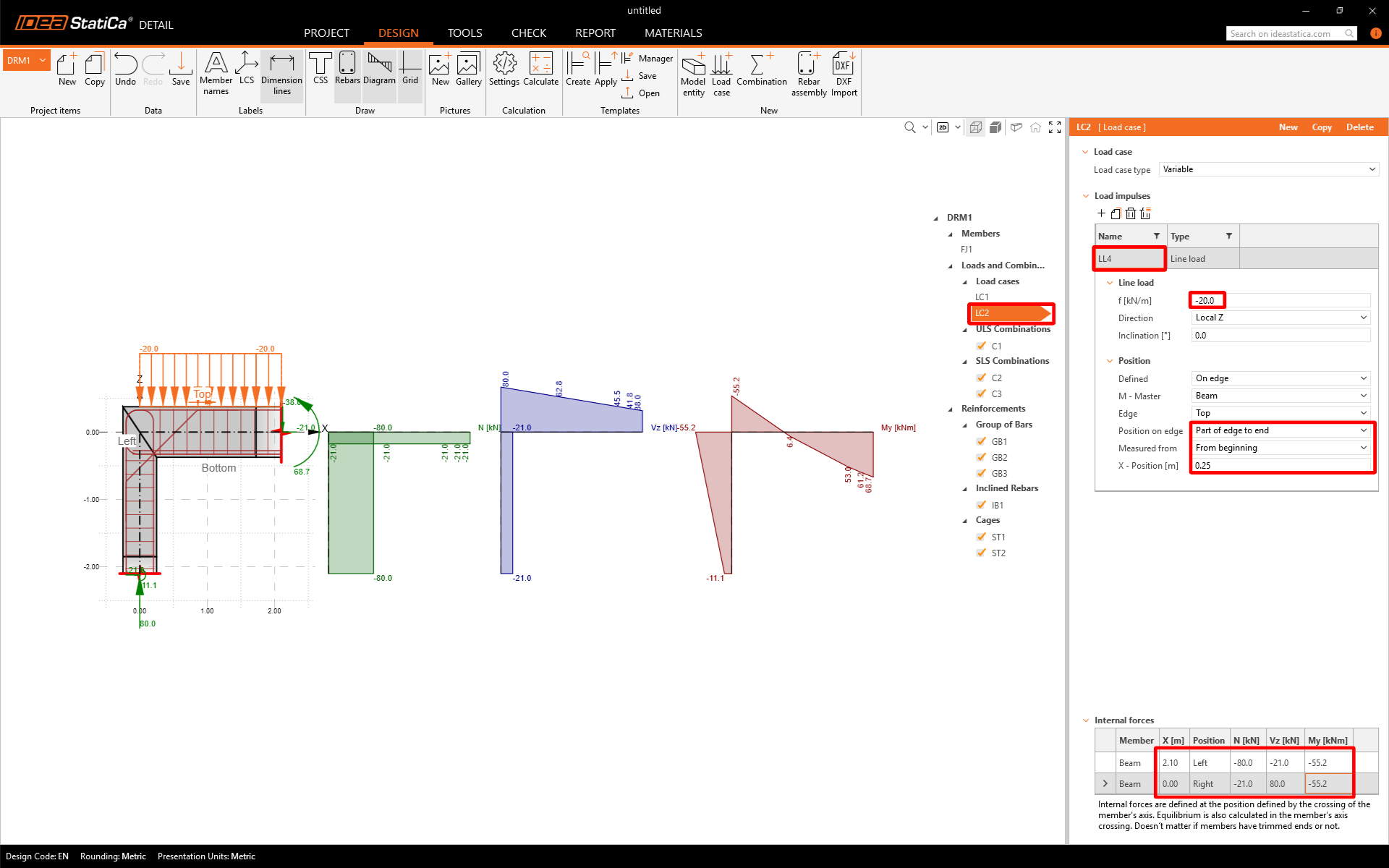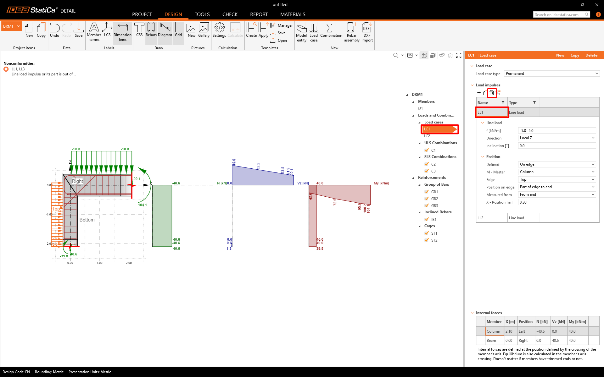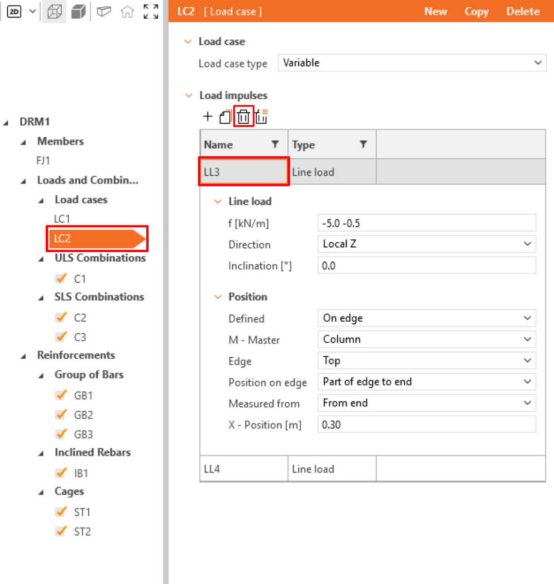 Wechseln Sie zum Lastfall LC2 und wiederholen Sie die Schritte mit anderen Werten. Löschen Sie zunächst die Streckenlast LL3.