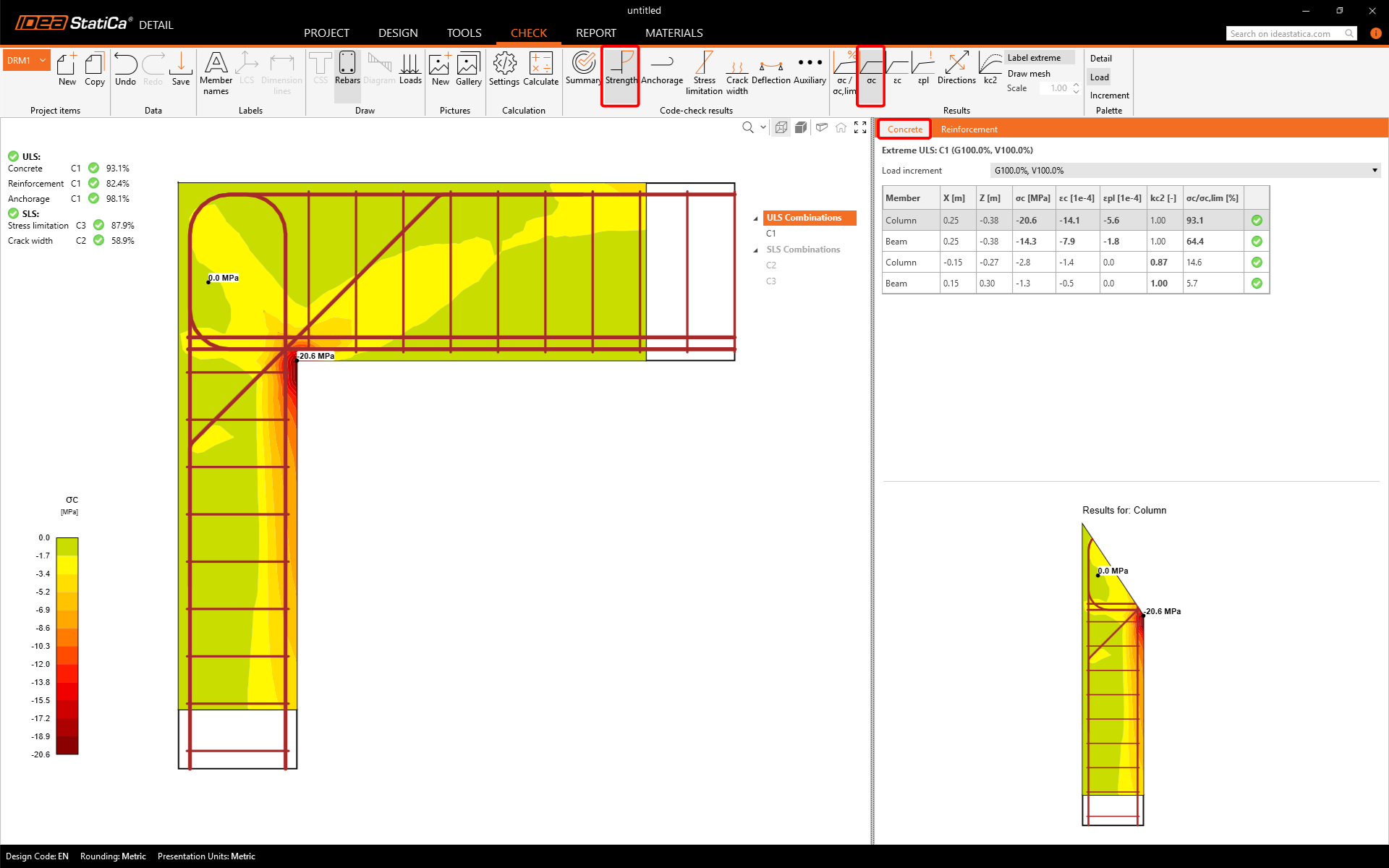Um die detaillierten Ergebnisse von GZT zu öffnen, klicken Sie auf das Symbol Tragfähigkeit. Wie oben in der Tabelle vermerkt, wurde die C1-Kombination zur Überprüfung der GZT verwendet.