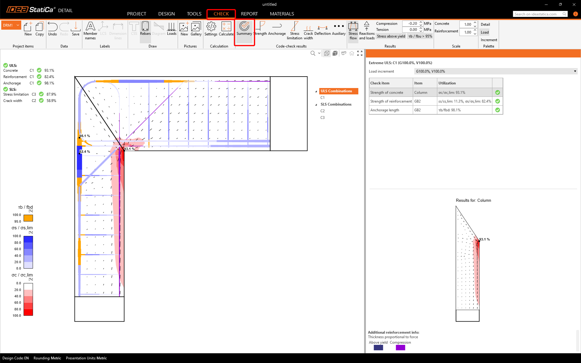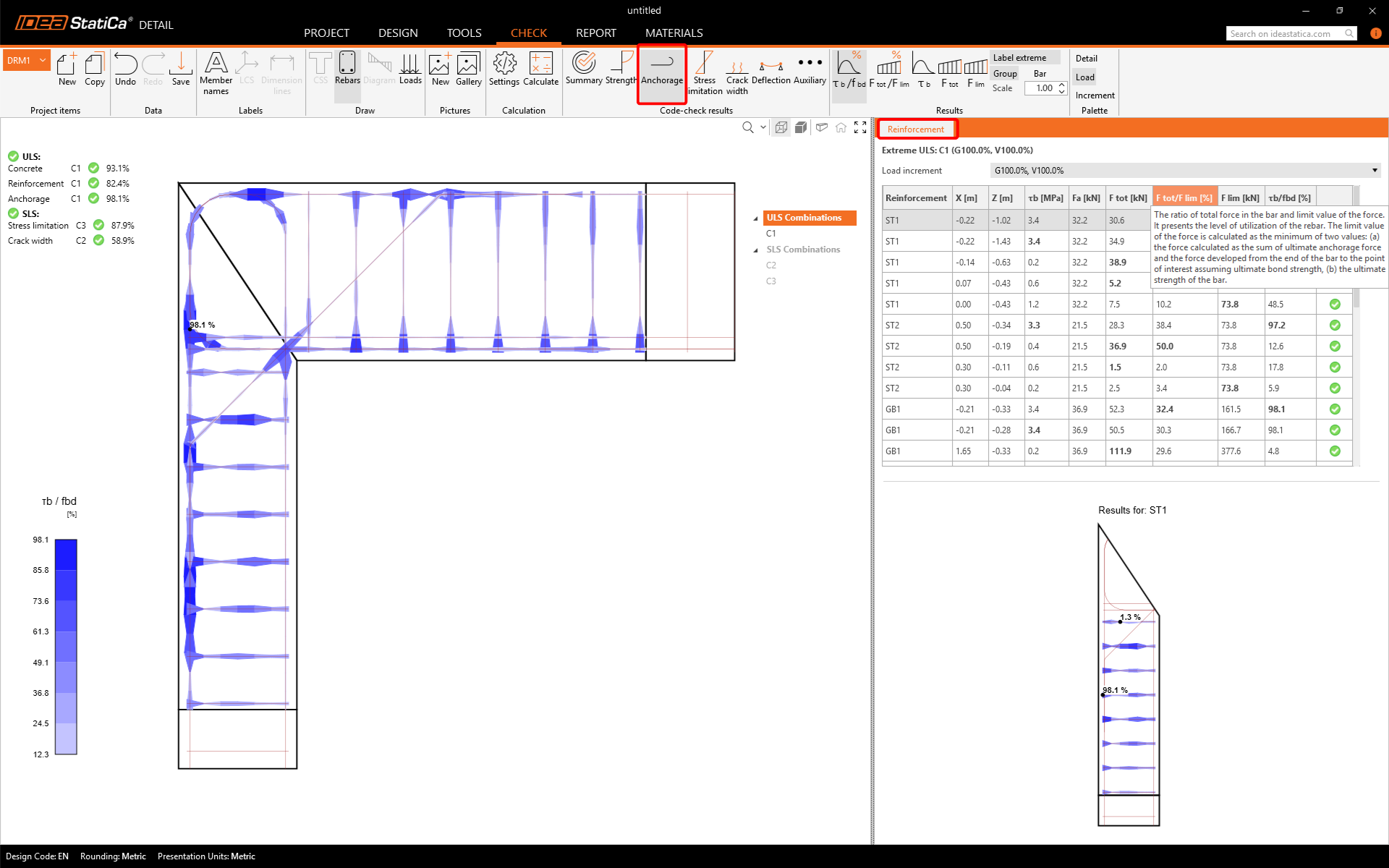 Mit Hilfe der Symbole im oberen Menüband können Sie alle Code-Nachweise anzeigen. In der Zusammenfassung werden die wichtigsten Ergebnisse für GZT/GZG dargestellt. Klicken Sie auf Verankerung , um die Auslastung des Verbundes zwischen Beton und Bewehrung anzuzeigen (in der Abbildung ist die kritischste Stelle markiert).