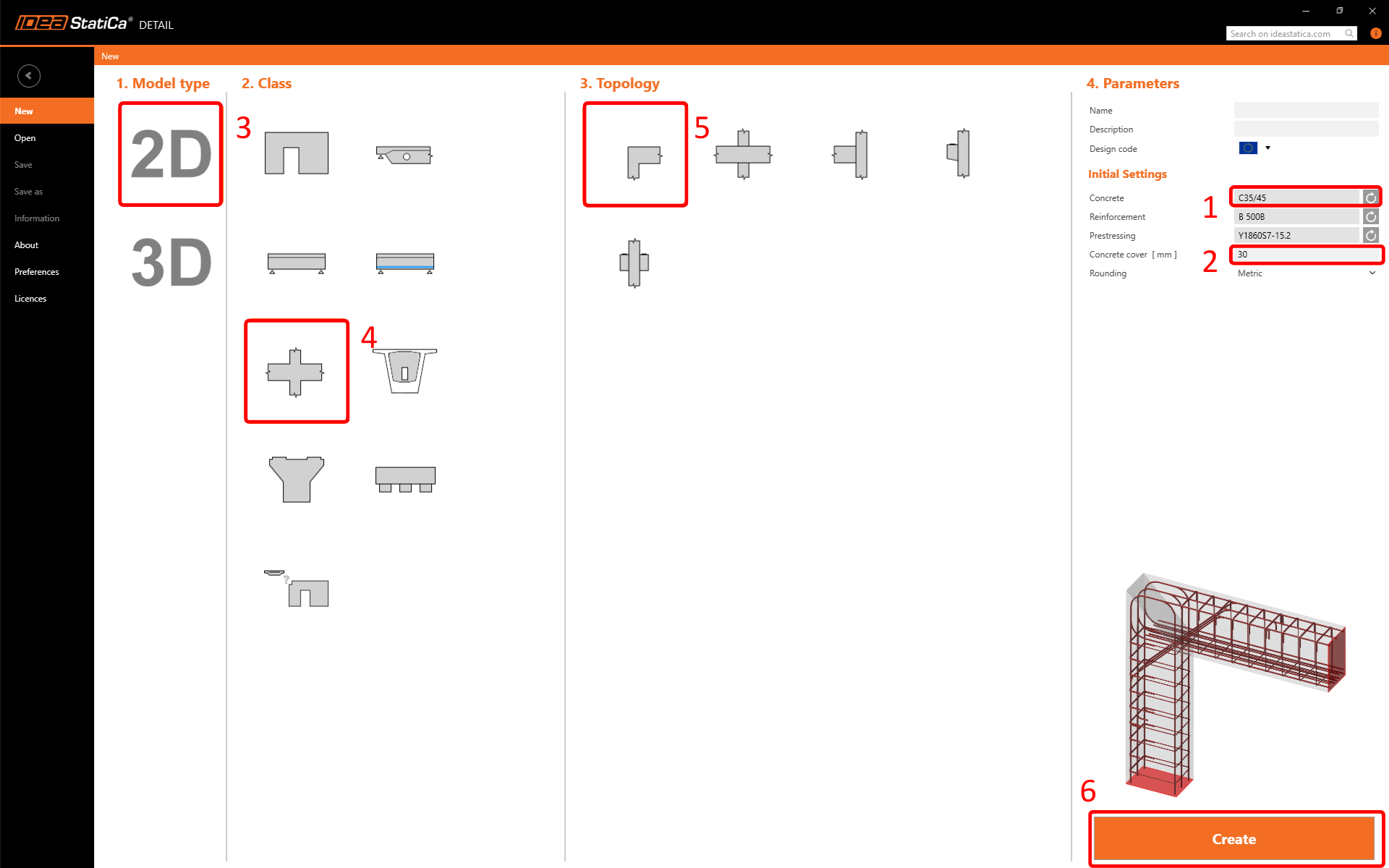 Starten Sie IDEA StatiCa und wählen Sie die Anwendung Detail. Es öffnet sich ein Assistentenfenster, in dem Sie die Beton- und Bewehrungsklasse festlegen und die Betondeckung definieren können.