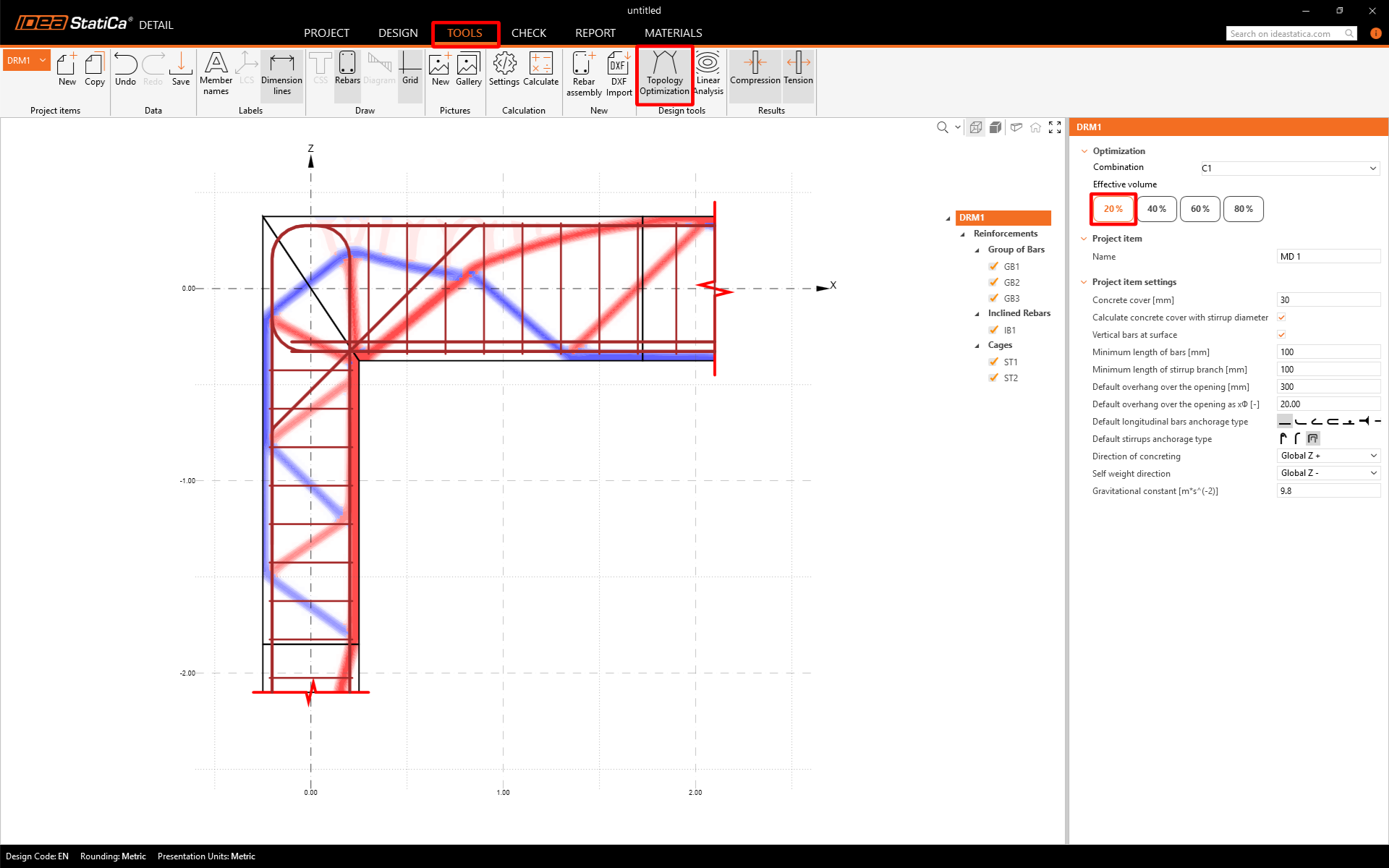 Sobald die Belastung definiert ist, können Sie mit der Bewehrungsführung fortfahren. Bevor Sie eine Bewehrung entwerfen, können Sie versuchen, die Topologieoptimierung (Fachwerkmodell) auszuführen, um zu sehen, wie das effektivste Bewehrungslayout aussehen sollte, wenn Sie das ausgewählte effektive Volumen der Struktur nutzen wollen.