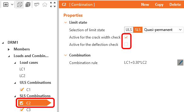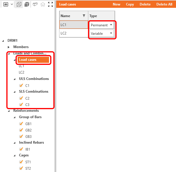 Fahren Sie im Baummenü mit der Definition der Lasten fort. Zwei Lastfälle und drei nichtlineare Kombinationen wurden von der Software automatisch hinzugefügt. Sie benötigen zwei Lastfälle, um zwischen ständigen und veränderlichen Lasten zu unterscheiden, und drei Kombinationen, um ULS- und SLS-Nachweise abzudecken.