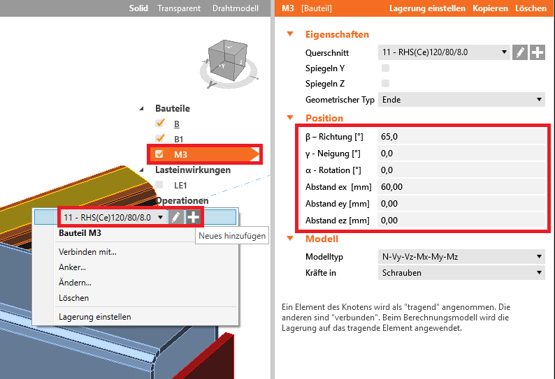 Bauteil M3 - Neues Bauteil hinzufügen und Querschnitt/Ausrichtung einstellen