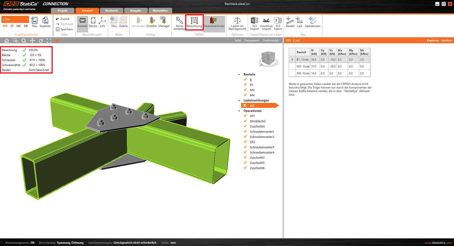 Wir starten die Analyse, indem wir Berechnung in der Registerkarte klicken. Das Analysemodell wird automatisch generiert, die Berechnung durchgeführt und der Gesamtnachweis wird zusammen mit den Basiswerten der Nachweisergebnisse angezeigt.