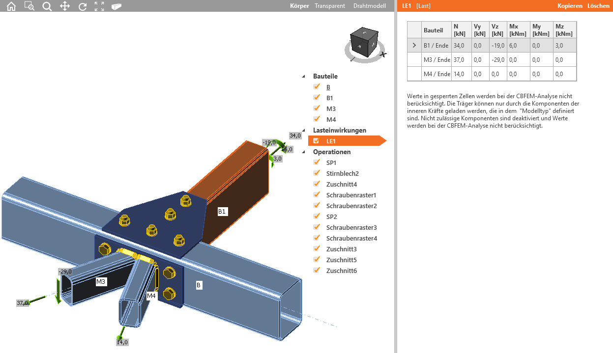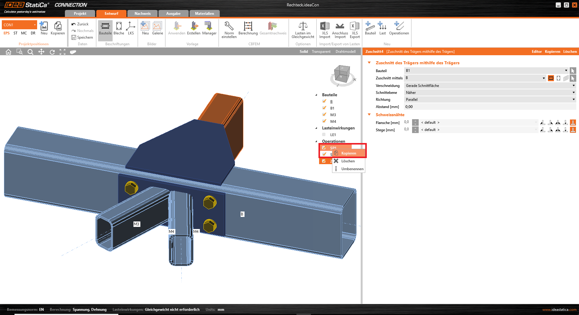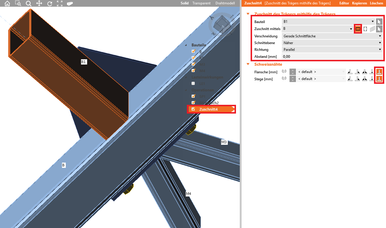 Wir fahren fort und fügen die Operation Schnitt hinzu, die durch einen Gehrungsschnitt zunächst die Bauteile M3 und M4 aufeinander zuschneidet, aber noch nicht mit der Stirnplatte verbindet.