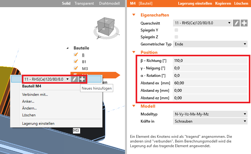 Bauteil M4 - Neues Bauteil hinzufügen und Querschnitt/Ausrichtung einstellen
