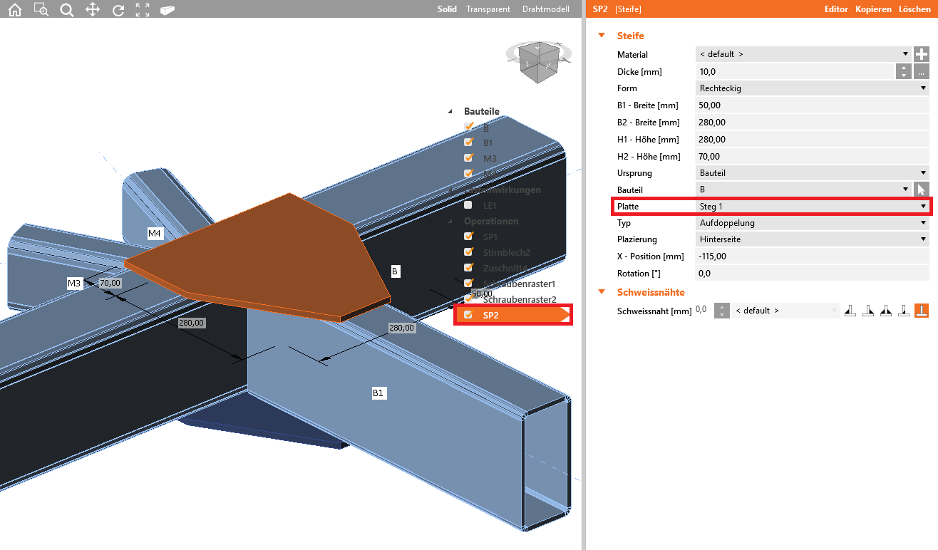 Wir fahren fort und fügen, durch die Kombination Rechtsklick und Kopieren, eine zweite Steife SP2 hinzu, mit der später die Bauteile B1 und B verschraubt werden.