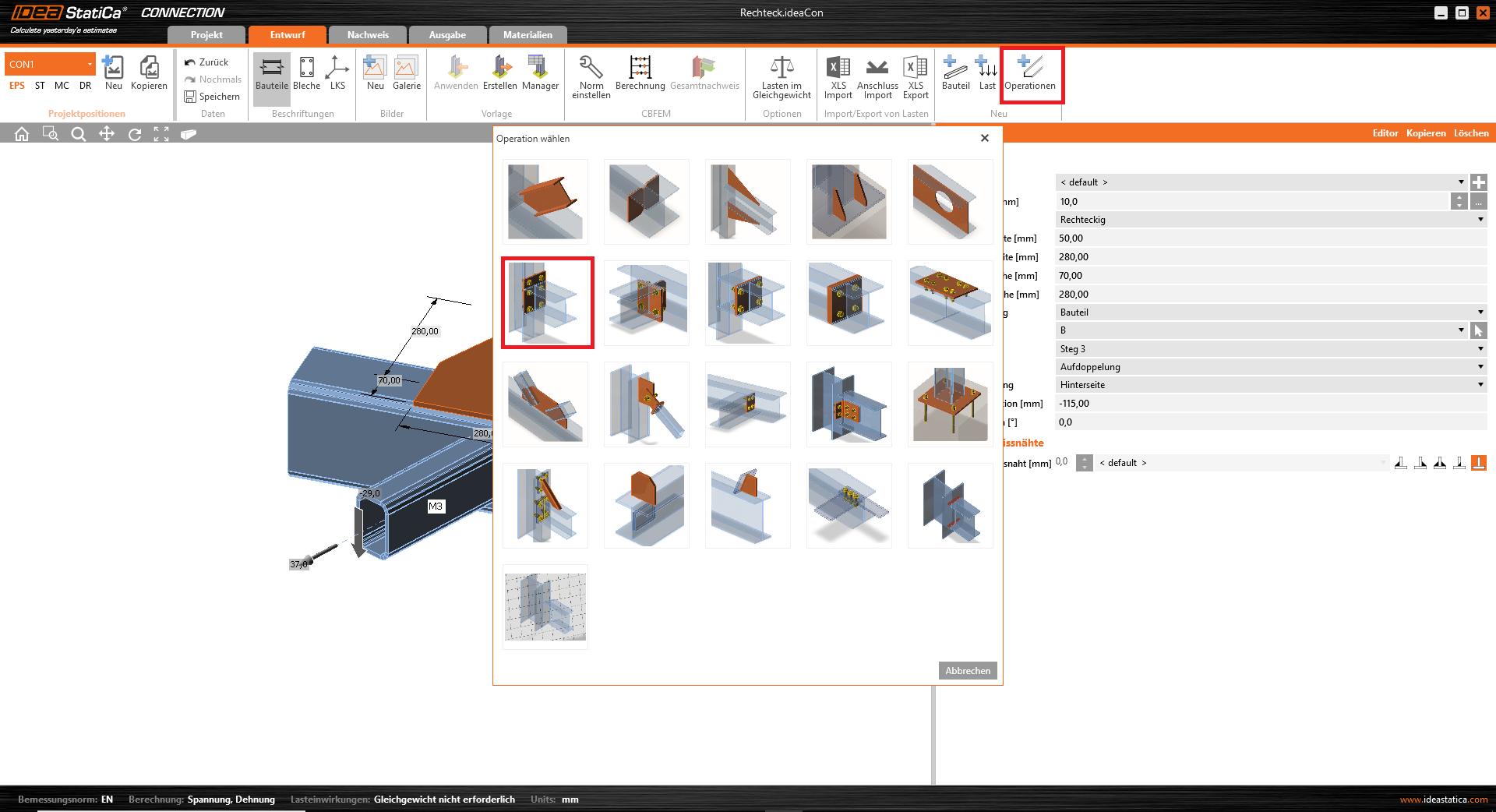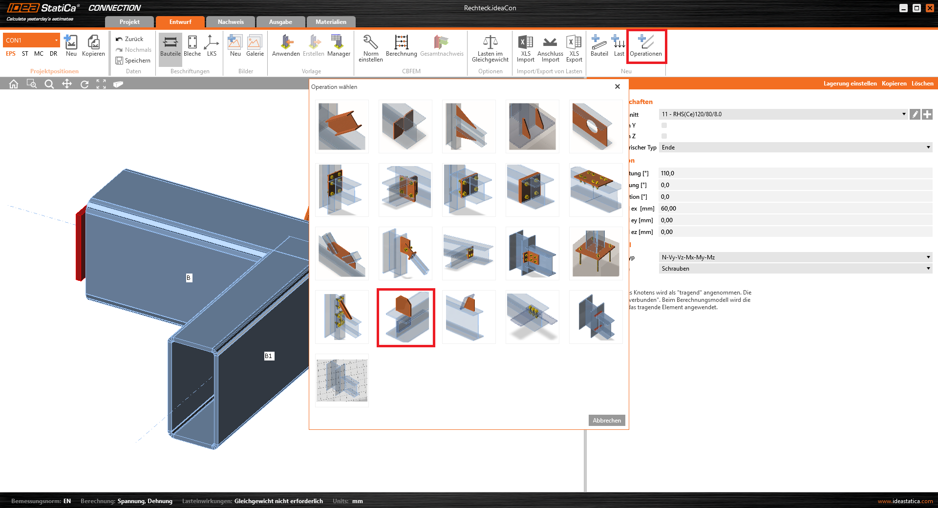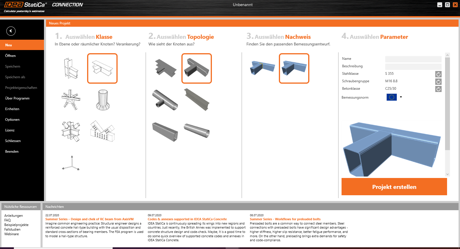 Lassen Sie uns IDEA StatiCa und die Anwendung Connection auswählen. Wir erzeugen ein neues Projekt, indem wir aus den Startvorlagen diejenige wählen, welche dem gewünschten Design am nächsten kommt. Dazu füllen wir den Namen aus, und wählen die Berechnungsnorm sowie die Standard–Materialeigenschaften – S355.
