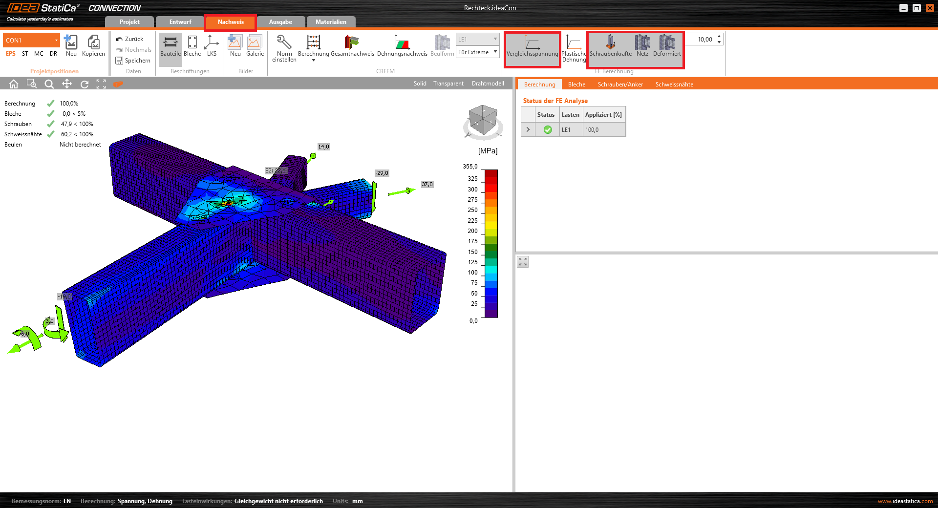 Wir wechseln zum Abschnitt Nachweis, wo wir die Vergleichsspannung, die Schraubenkräfte, das Netz und die Verformung aktivieren, um zu sehen, was im Anschluss passiert.