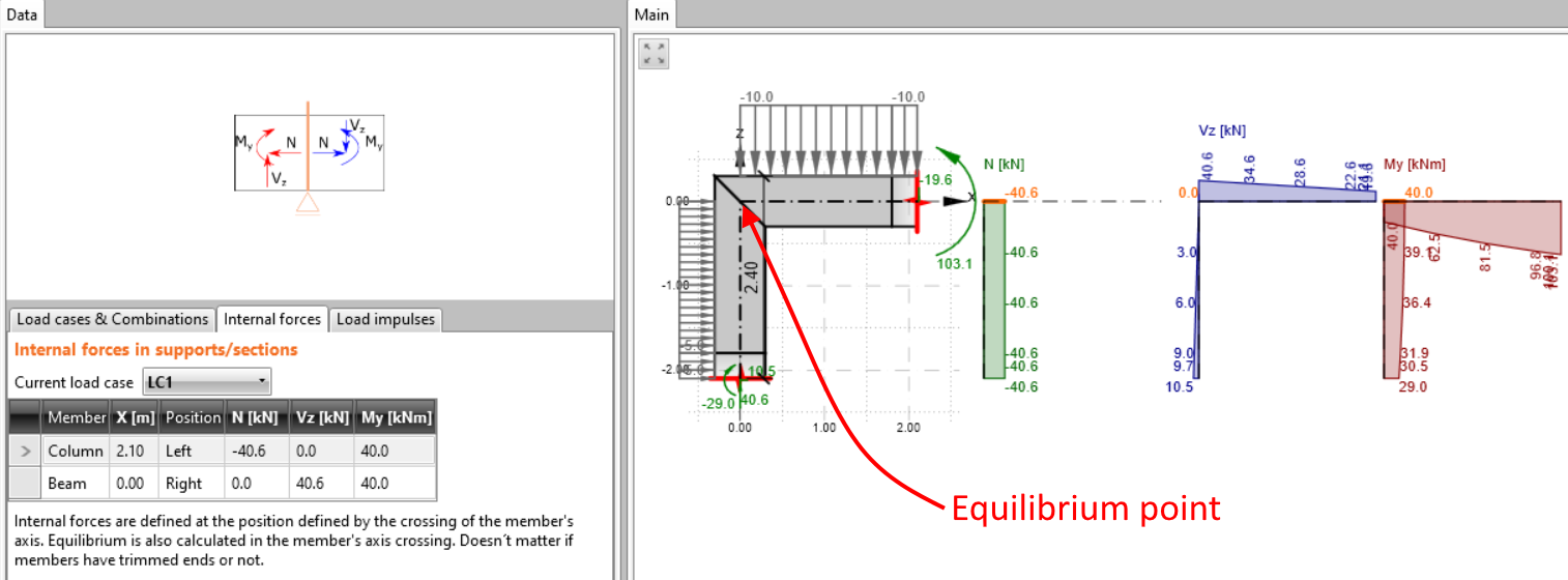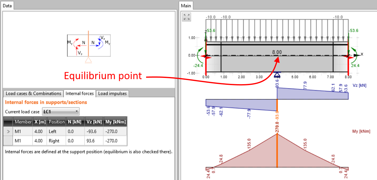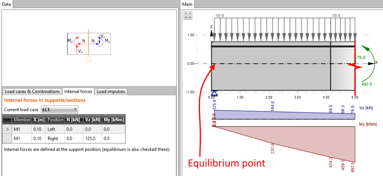 Auch bei diesem Typ liegt der Gleichgewichtspunkt wieder über der Lagerung, und die Annäherung ist fast die gleiche wie beim Beispiel der Randlagerung. Der einzige Unterschied besteht in der Eingabe der Schnittgrößen. Sie müssen sie von beiden Seiten der Lagerung aus einstellen. Die Richtigkeit kann anhand des Schnittgrößendiagramms und der Reaktion im Auflager überprüft werden - dieser Wert sollte gleich der absoluten Summe der Scherkräfte sein.