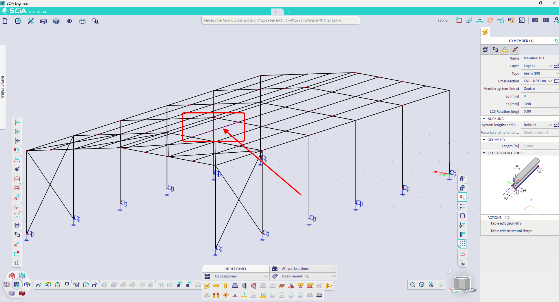 In SCIA Engineer, select one of the inside members, as shown in the picture.
