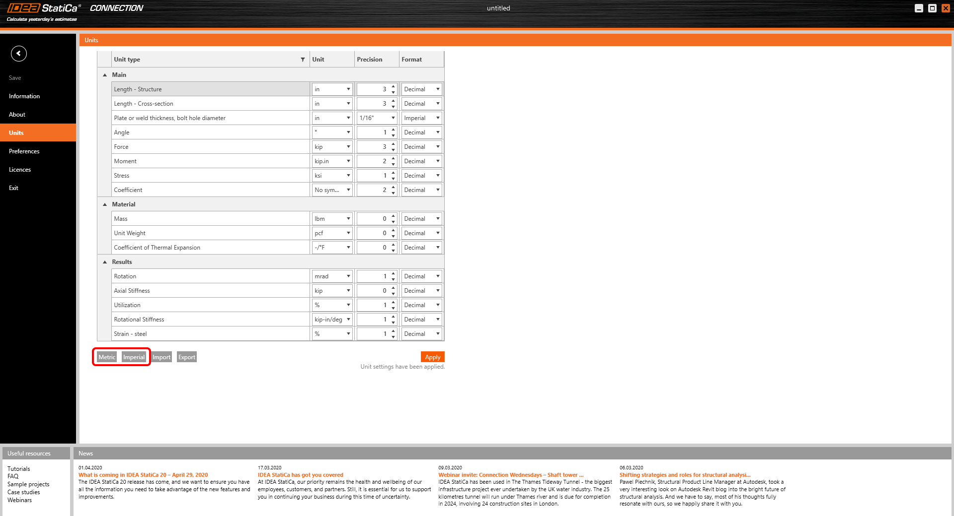 Das Einheiten-System, seine Genauigkeit und sein Format können jederzeit während Ihrer Arbeit in IDEA StatiCa Connection geändert werden. Es gibt zwei Möglichkeiten, die Einstellungen einzugeben:
