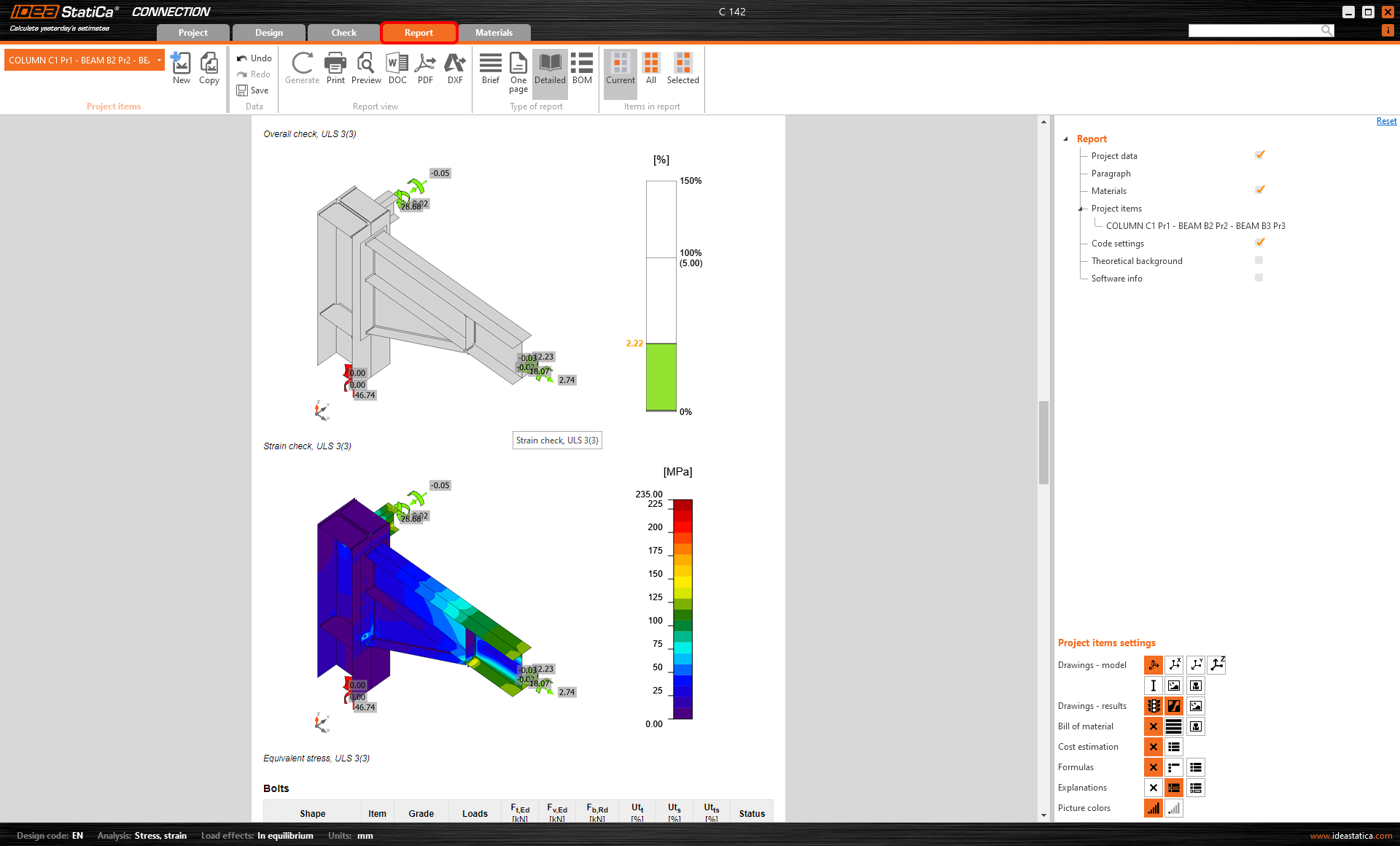 Wechseln Sie als Nächstes zum Tab Bericht. IDEA StatiCa bietet einen vollständig anpassbaren Bericht zum Ausdrucken oder Speichern in einem bearbeitbaren Format an.