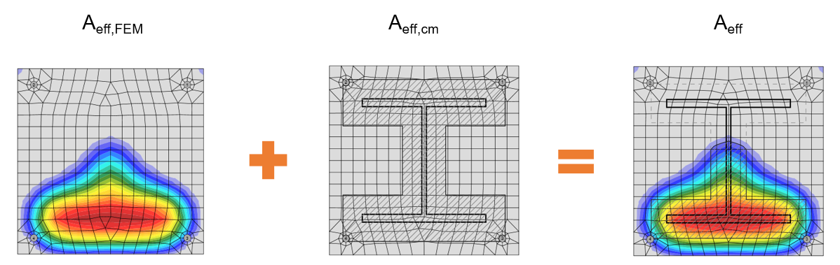 Zum Ermitteln der Kontaktspannung ist die für die Kontaktspannung wirksame Fläche Aeff erforderlich; die wirksame Fläche Aeff ist die Schnittmenge aus den Fläche Aeff,FEM (über die FEM ermittelte, auf Druck belastete Fläche im Modell) und Aeff,cm (In Abhängigkeit des Querschnitts für die Druckbelastung wirksame Fläche).