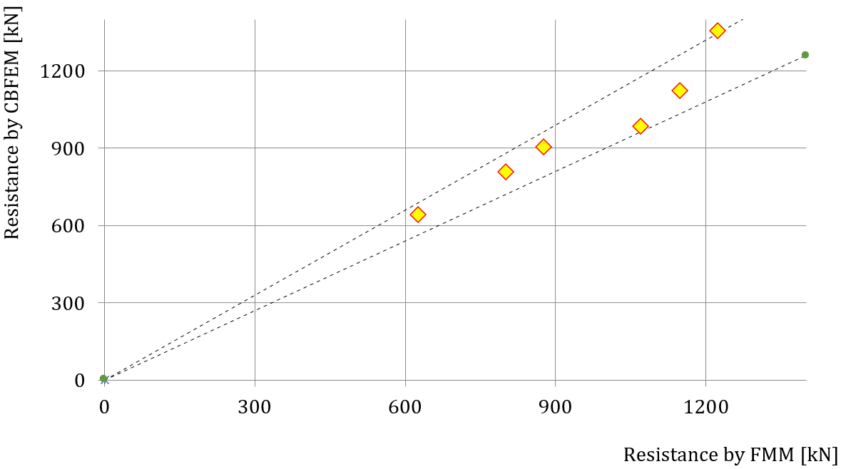 In general, manual calcs provided by the code tend to be rather conservative. In this very case, it is vice versa, and the double-checked finite element solution providing a precise model simply displays a lower capacity by about 20% in both numerical models compared to the hand calculations. In conclusion, this is due to the spatial deformations and punching of the main beam.