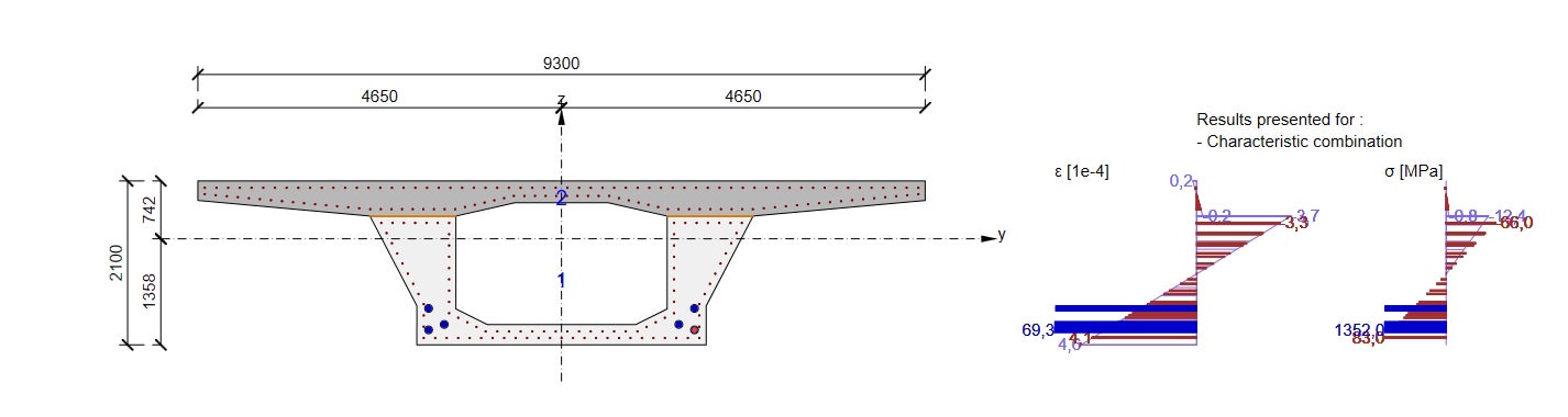 The balanced cantilever method involves a series of construction stages, with each segment requiring a distinct design. Furthermore, the design of each cross-section was carried out in two phases, first for the lower U-shaped portion and, subsequently, in conjunction with the upper deck. This intricate process is time-intensive and intricately connected to the time allocated for calculations. Nonetheless, this meticulous approach is a common feature, together with the camber configuration, of projects of this kind.