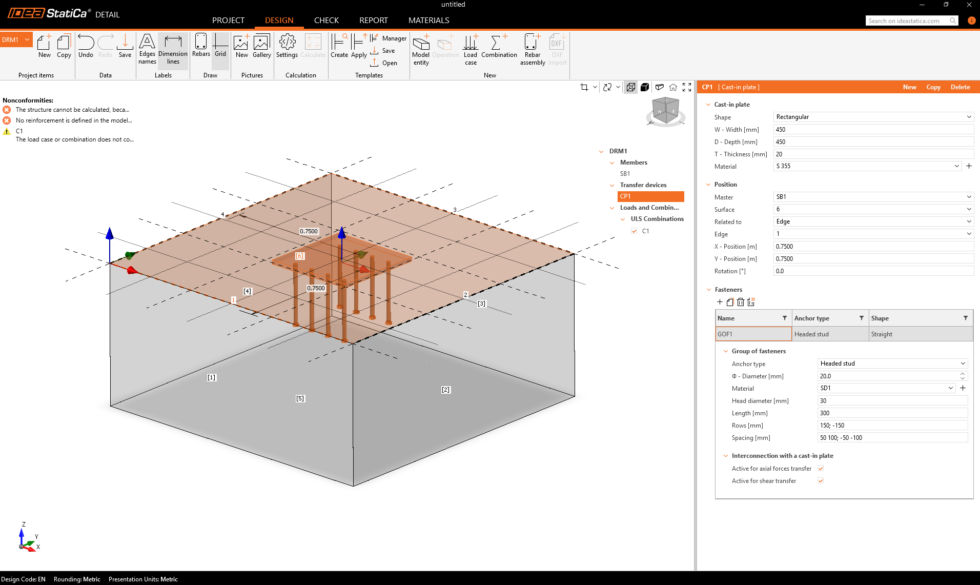 When implemented in IDEA StatiCa Detail, cast-in plates unlock more anchoring possibilities for reinforced concrete blocks, allowing engineers to design and analyze complex anchorage systems. This integration enables optimized designs and a more efficient workflow in reinforced concrete detailing.