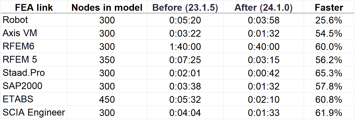 We improved processes during the import of a single connection and member in FEA imports by reducing unnecessary API calls we use during import. This results in significantly faster import times for specific BIM links.
