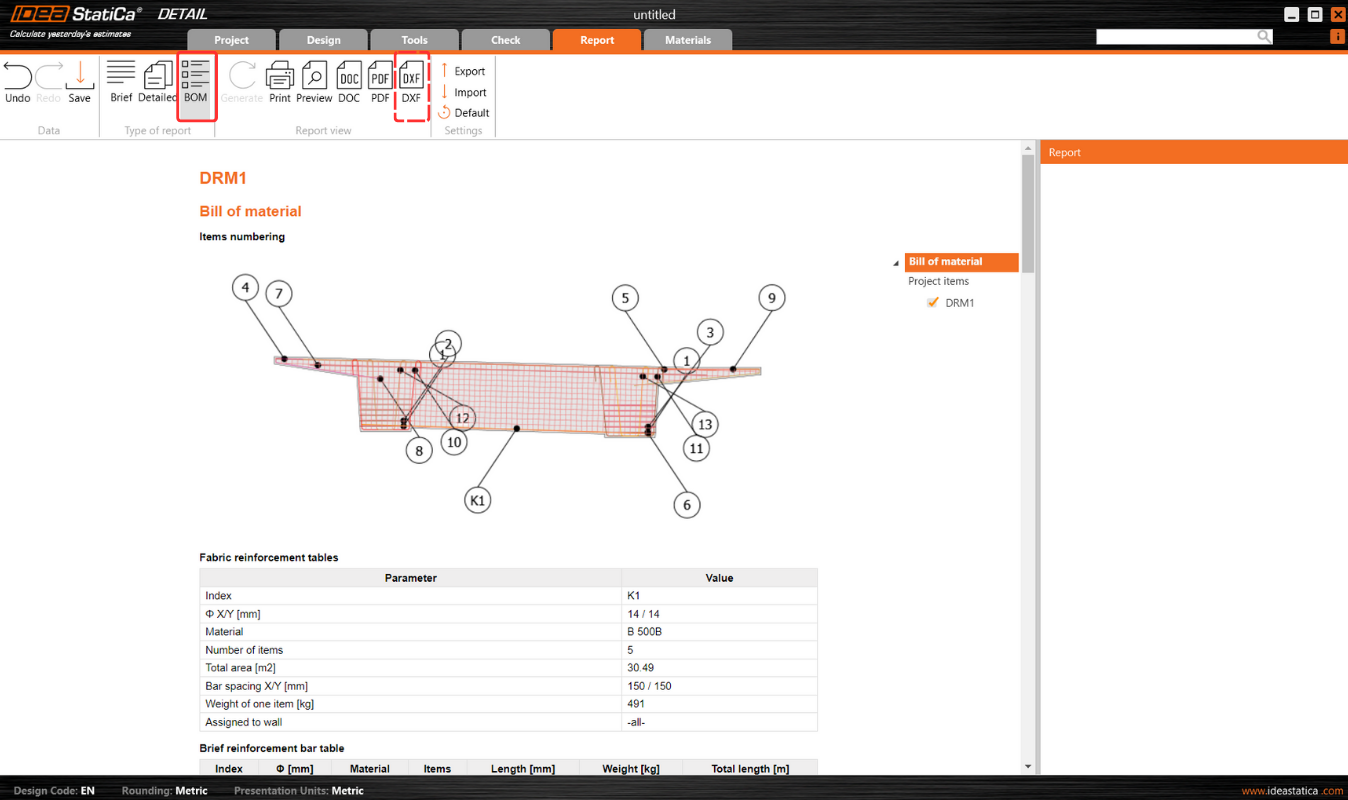 Bill of Material (BOM) offers advanced features such as displaying rebar model entity names within the rebar table. This enhancement aids in effortlessly identifying rebars in the BOM, correlating them with their respective entities in the model. BOM also provides an option for the scheme to export reinforcement into dxf.
