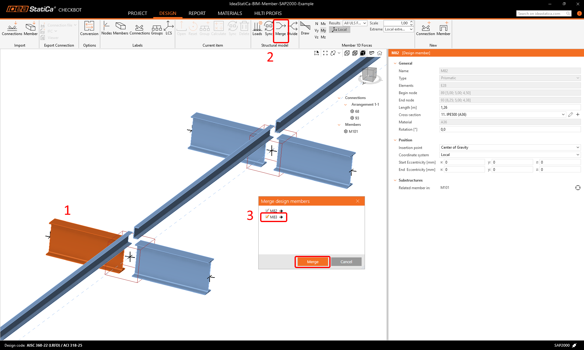 Merge both perpendicular related members. Left-click the I-profile M-82, select Merge operation, then tick the M83 box in the merge design window, and follow the steps as shown in the picture.