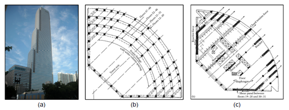 Figura 4.5: a) Torre Miami, b) disposición estructural de las plantas, y c) disposición de las columnas móviles (Taranath, 2010).