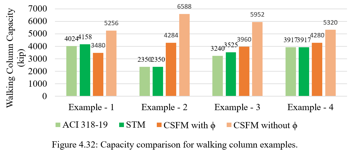 En la Figura 4.32, que ofrece una comparación gráfica de las capacidades de todos los métodos y ejemplos, se ilustra claramente la relación entre los distintos enfoques analíticos. La figura destaca los notables aumentos de capacidad cuando no se aplican factores de reducción de resistencia en el análisis CSFM. La representación visual muestra claramente cómo las capacidades predichas por CSFM sin valores ϕ son sistemáticamente superiores en todos los ejemplos en comparación tanto con STM como con ACI 318-19.
