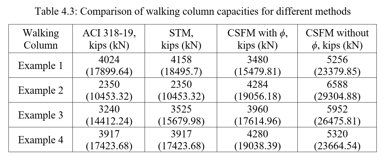 En la tabla 4.3 se comparan las capacidades de los pilares rodantes, evaluadas mediante ACI 318-19, STM y CSFM con y sin factores de reducción de resistencia, ϕ. Los datos revelan varios patrones y distinciones en el comportamiento de las columnas bajo diferentes enfoques analíticos. Una comparación detallada de los resultados demuestra que las capacidades predichas por CSFM sin ϕ son sistemáticamente superiores a las obtenidas utilizando STM y CSFM con ϕ, con variaciones en función del ejemplo específico analizado.