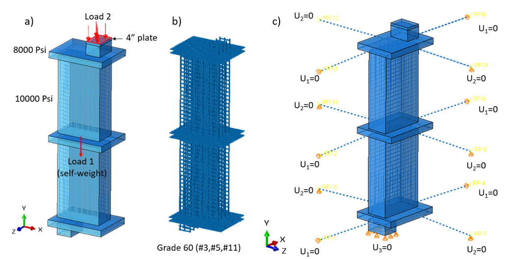 Figura 4.10: Configuración del modelo en ABAQUS mostrando: a) las ubicaciones y detalles de la carga aplicada, b) detalles de las barras de refuerzo, y c) condiciones de contorno.