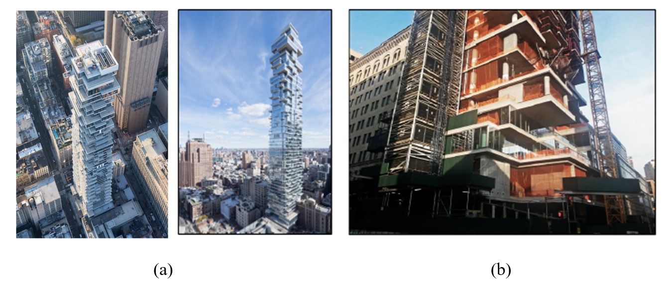 El 56 Leonard, situado en Manhattan, Nueva York, se construyó en 2016. Es un ejemplo sorprendente de la aplicación de columnas móviles en la arquitectura moderna (Figura 4.2). Los pisos del edificio de 60 plantas y 821 pies de altura aparecen apilados de forma irregular, recordando a un juego de "Jenga" (Lubell, 2015).