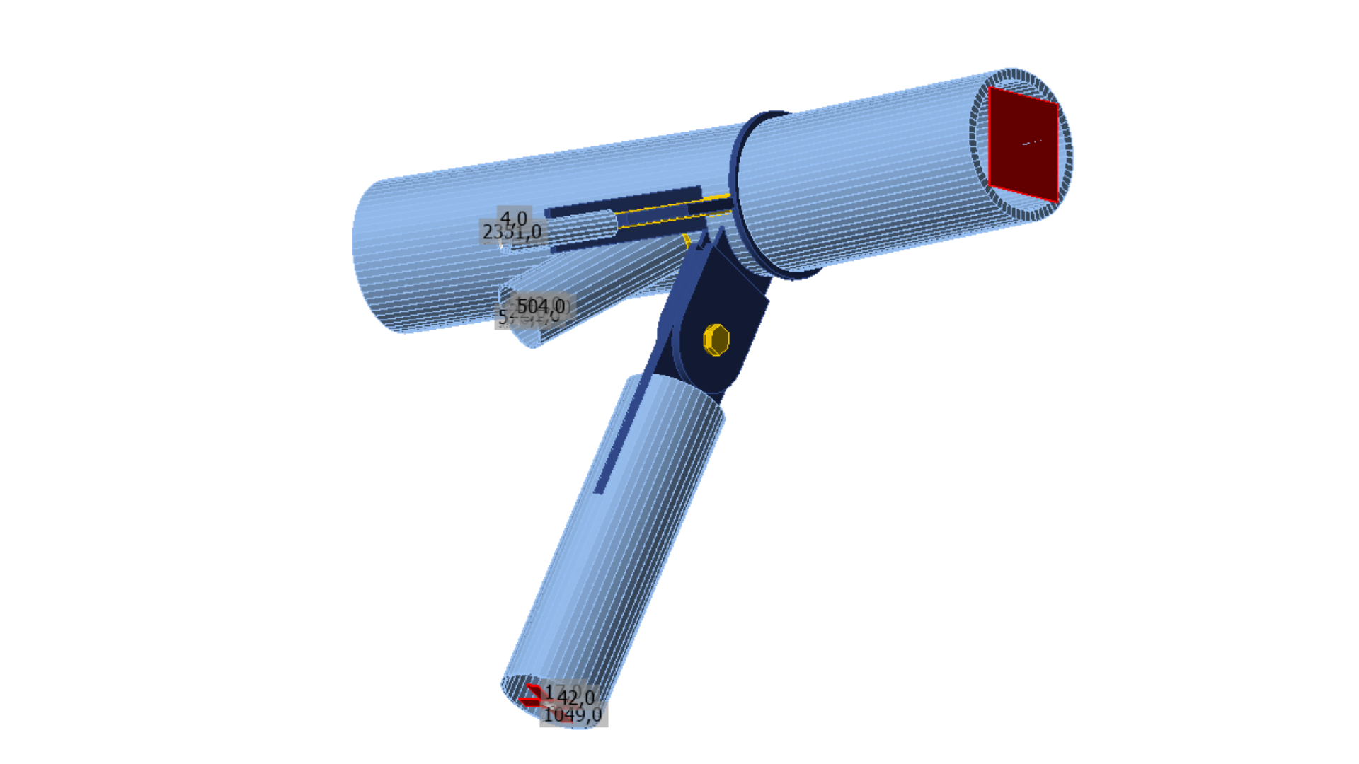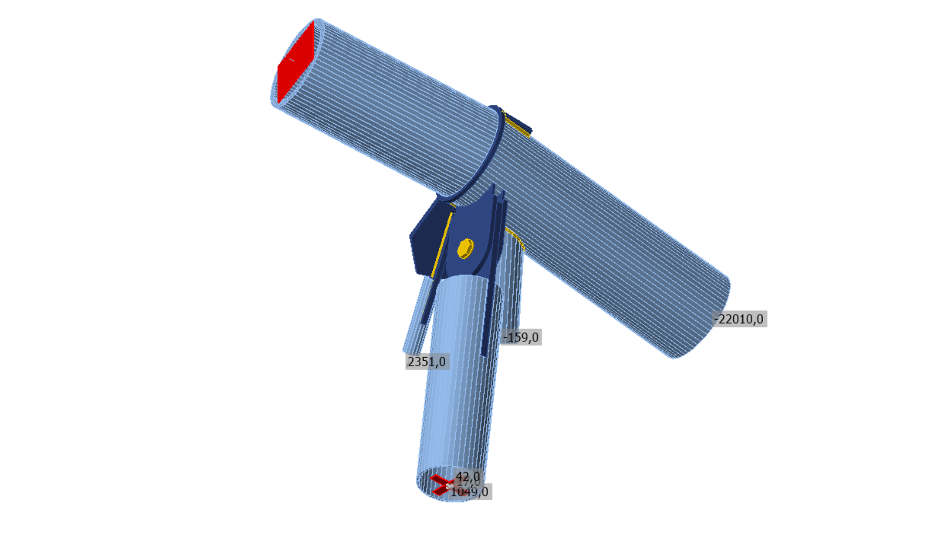 Inner and outer columns are supported at podium level by reinforced concrete elements. The nodal design task is typified by the 7-8 elements of nodes, complex loading scenario and geometry.