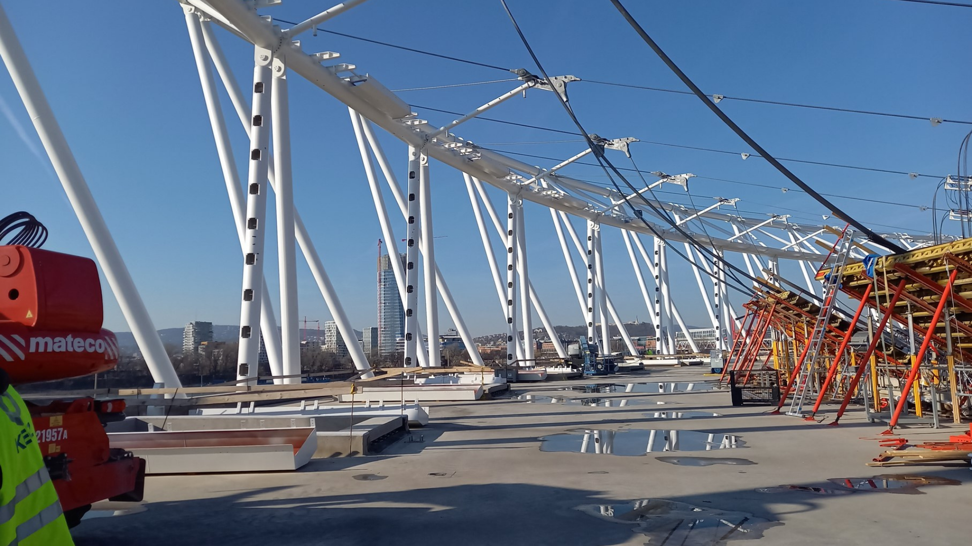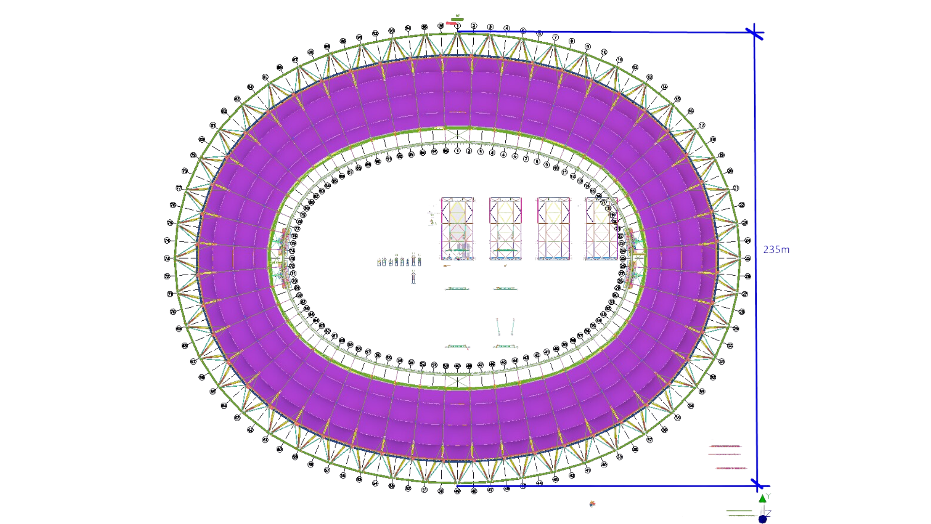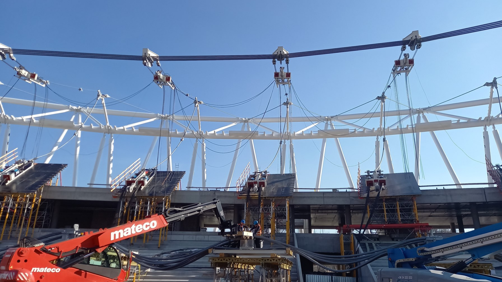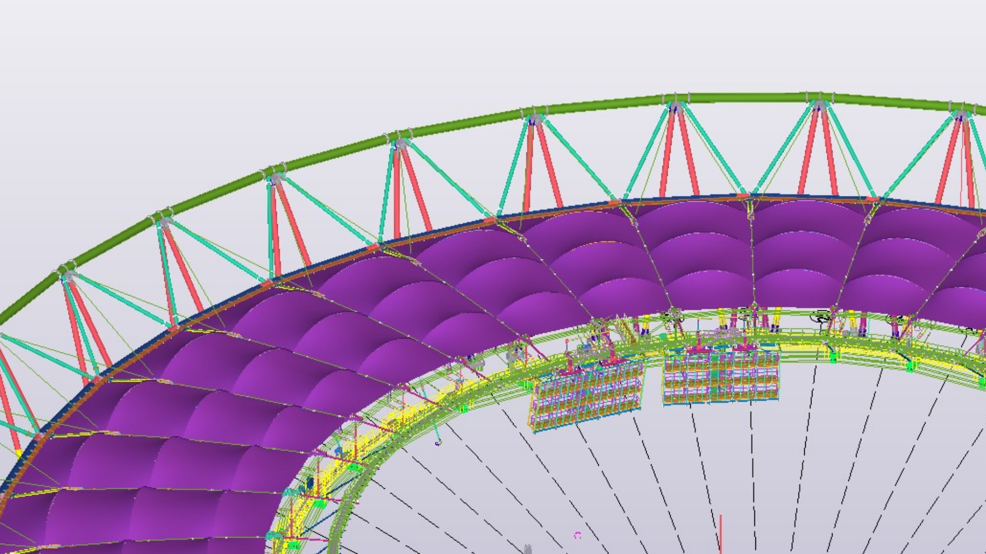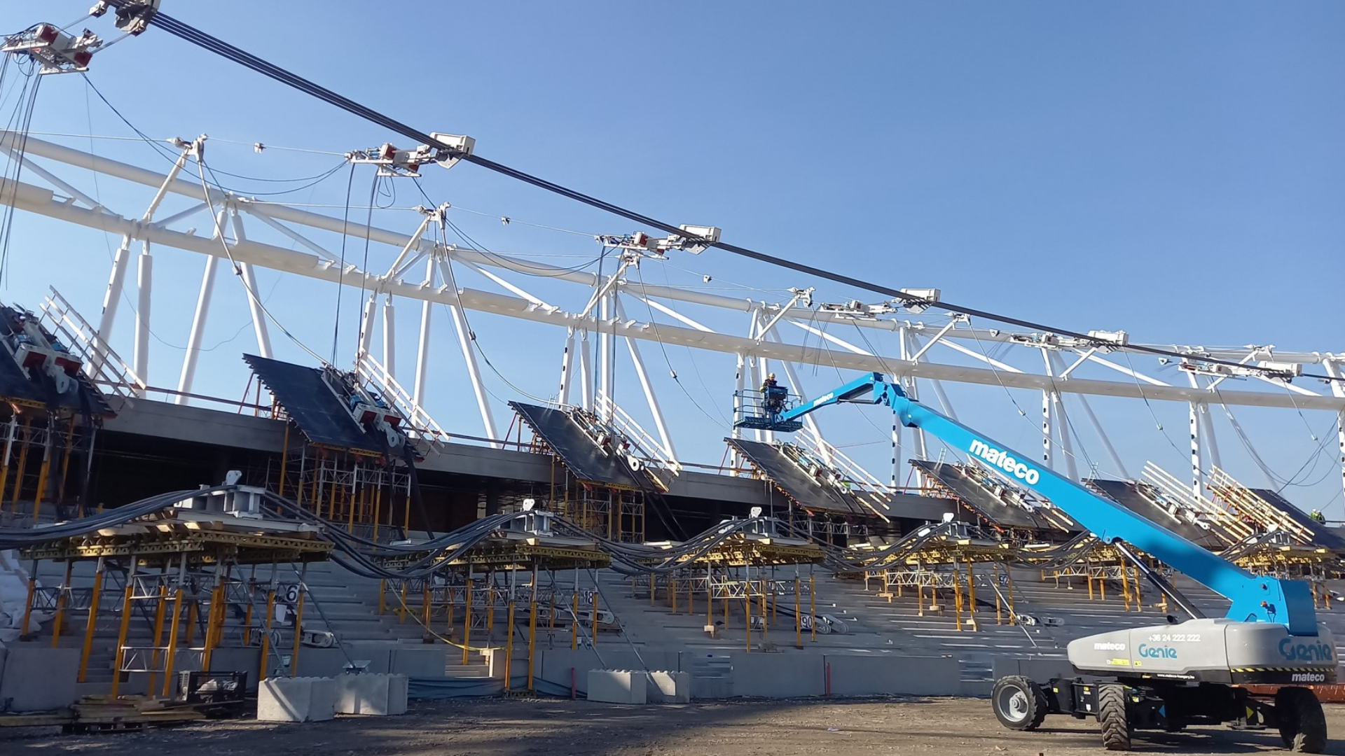 The project features a primary pre-stressed cable net supported by an inclined two-chord compression rigid truss. This latter rigid steel structure forms the nodal structures mainly conducted by the tension of the cables.