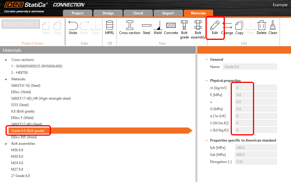 Si un attribut de matériau est rempli avec 0 (zéro) ou une valeur non acceptable et ce matériau est utilisé dans le projet, le modèle d'éléments finis ne peut pas être calculé et l'analyse s'arrête à 0%. Il peut s'agir d'un attribut d'une section transversale, d'un matériau en acier, d'une classe de boulon, etc.