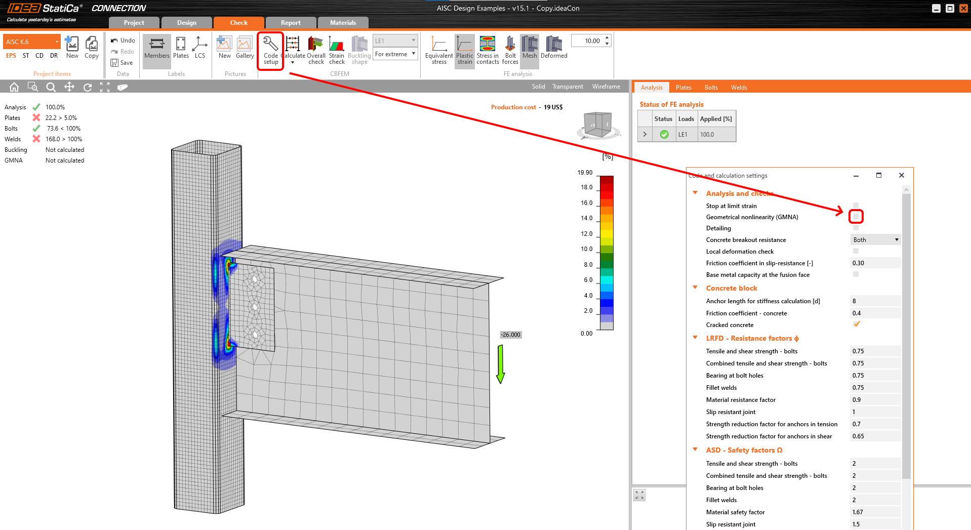 En désactivant le GMNA dans le paramétrage de norme, l'analyse se termine à 100%, révélant la défaillance de la section creuse et d'autres parties des assemblages.
